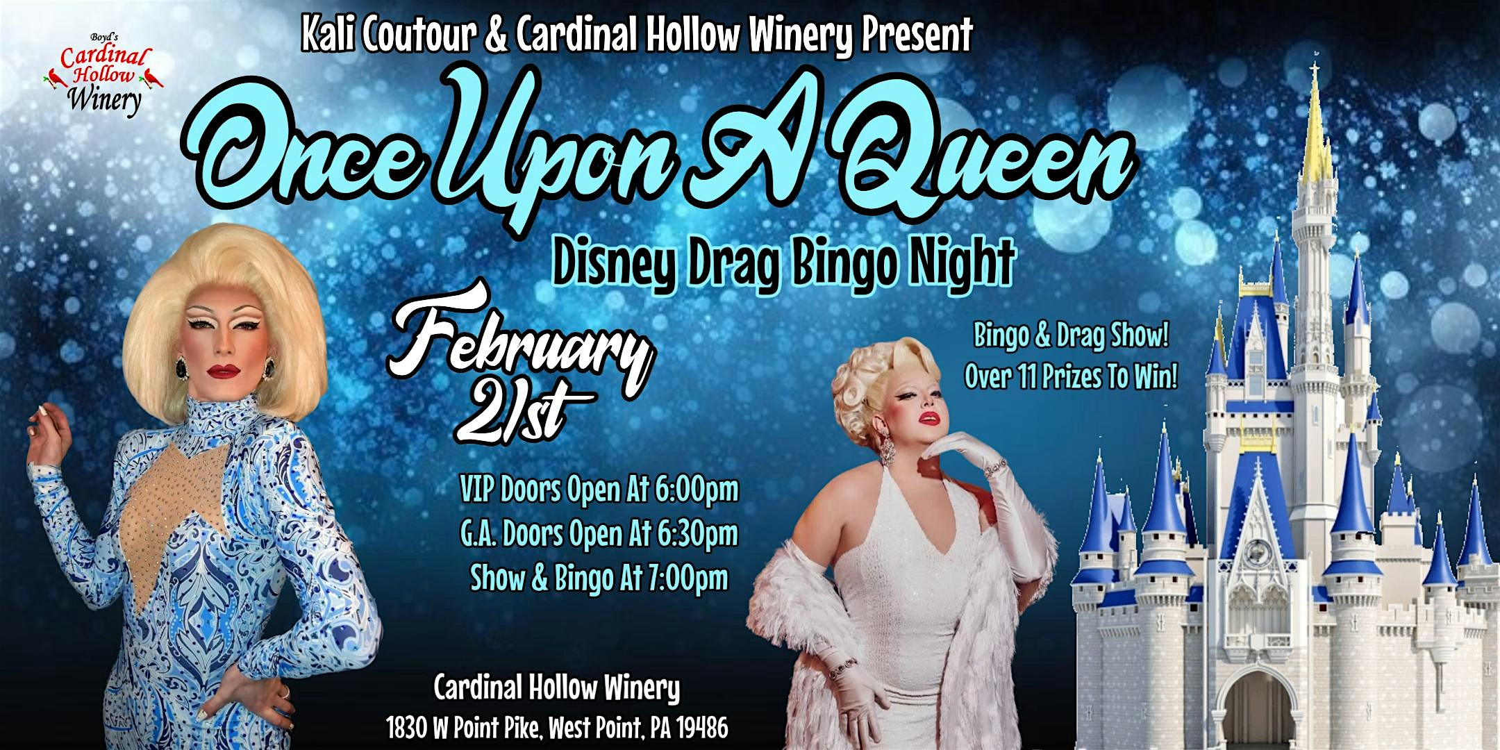 by admin13Feb ONCE UPON A QUEEN Disney Drag Bingo Night at Boyd’s Cardinal Hollow Winery – West Point, PA ONCE UPON A QUEEN Disney Drag Bingo Night at Boyd’s Cardinal Hollow Winery – West Point, PA 2 2 people viewed this event. Get ready to experience a magical mashup of Disney, drag queens, and bingo fun at our Drag Bingo event! Tickets-RSVP Link Date And Time Saturday, February 21st, 2026 11:00 PM (PST) Venue Boyd's Cardinal Hollow Winery Location 1830 West Point Pike, West Point, PA 19486 Event Types Party or Social GatheringPerforming & Visual Arts Event Category Pennsylvania Share With Friends Facebook Twitter Linkedin Xing Pinterest Share This Post: