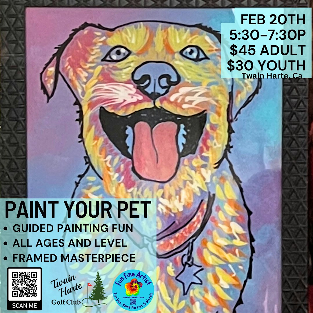 by admin13Feb Paint your Pet Party at Twain Harte Golf Club – Twain Harte, CA Paint your Pet Party at Twain Harte Golf Club – Twain Harte, CA 2 2 people viewed this event. All ages are invited to paint your pet portrait on a glass frame at this event. Painting instruction and all supplies included. Tickets-RSVP Link Date And Time Saturday, February 21st, 2026 01:00 AM (PST) Venue Twain Harte Golf Club Location 22909 Meadow Drive, Twain Harte, CA 95383 Event Types Community & CultureParty or Social Gathering Event Category California Share With Friends Facebook Twitter Linkedin Xing Pinterest Share This Post: