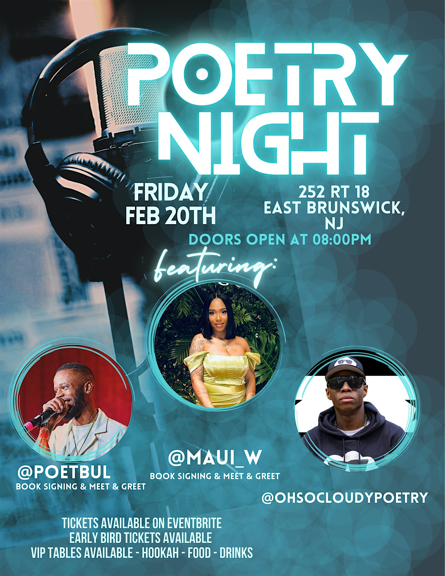 by admin12Feb Poetry Night at 252 NJ-18 – East Brunswick, NJ Poetry Night at 252 NJ-18 – East Brunswick, NJ 2 2 people viewed this event. An intimate poetry night featuring guest poets Maui, PoetBul, and Ohsocloudypoetry—raw words, deep vibes, unforgettable energy. Tickets-RSVP Link Date And Time Saturday, February 21st, 2026 01:00 AM (PST) Venue 252 NJ-18 Location 252 New Jersey 18, East Brunswick, NJ 8816 Event Types Concert or PerformancePerforming & Visual Arts Event Category New BrunswickNew Jersey Share With Friends Facebook Twitter Linkedin Xing Pinterest Share This Post: