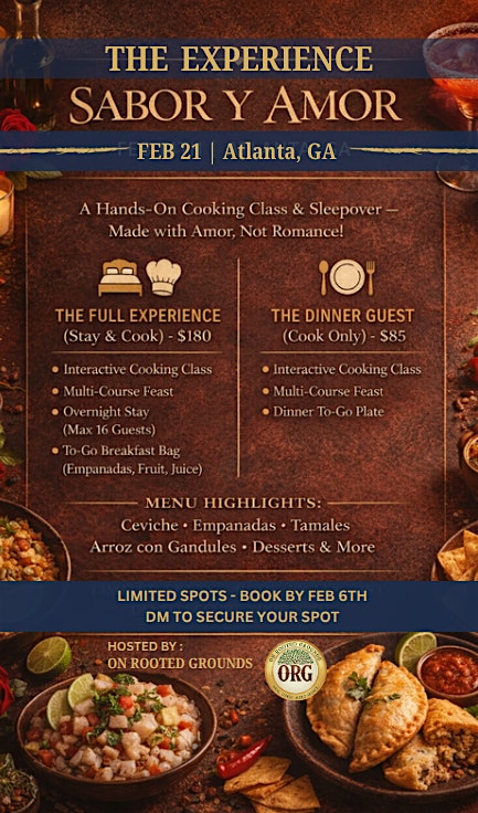 by admin13Feb PRIVATE EVENT: Sabor y Amor – at Private Location – Altanta, GA PRIVATE EVENT: Sabor y Amor – at Private Location – Altanta, GA 4 4 people viewed this event. The Ultimate Latin Cooking Retreat & Sleepover ️ Tickets-RSVP Link Date And Time Saturday, February 21st, 2026 11:00 PM (PST) Venue Private Location Location Downtown, Altanta, GA 30305 Event Types Food & DrinkParty or Social Gathering Event Category Georgia Share With Friends Facebook Twitter Linkedin Xing Pinterest Share This Post: