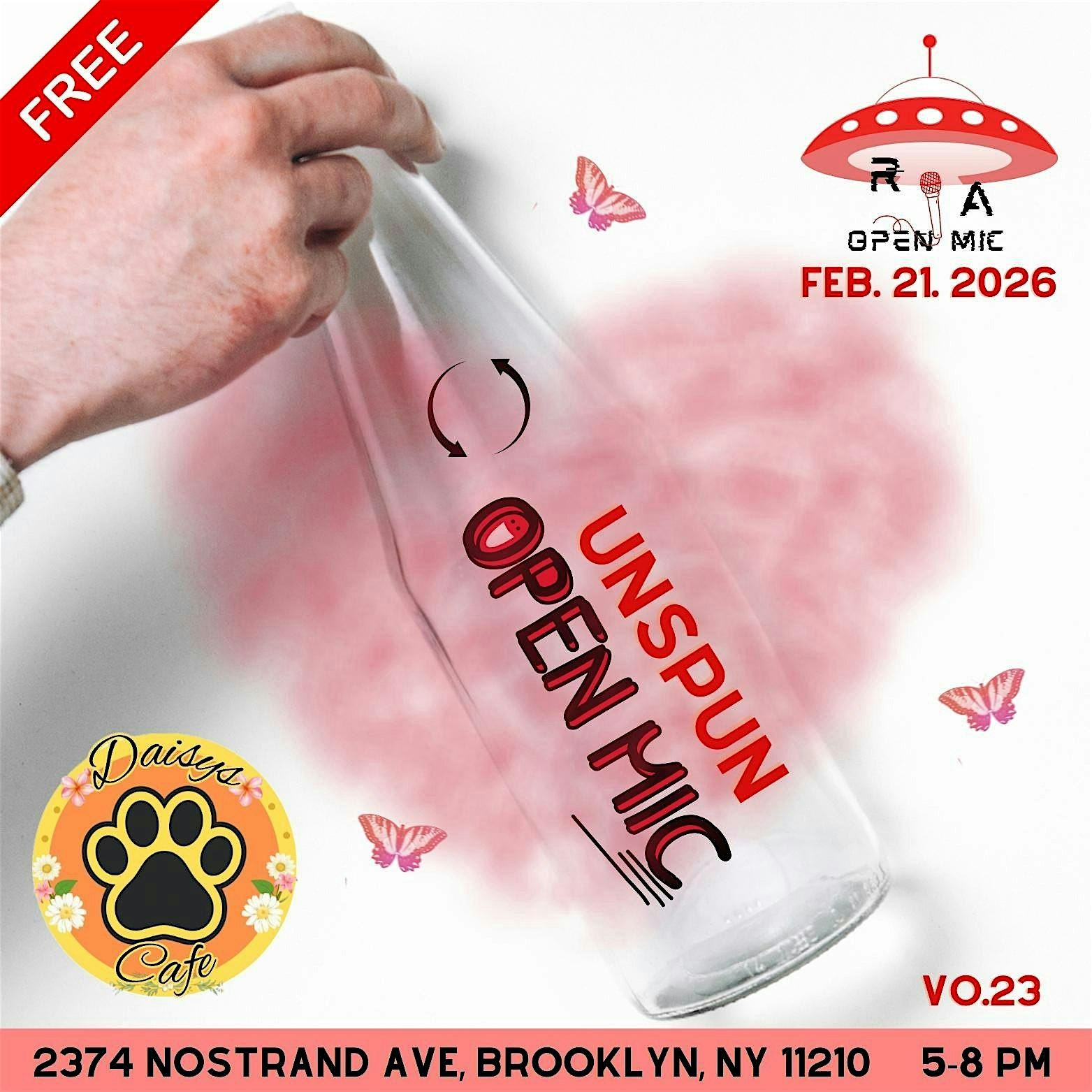 by admin13Feb RA OPEN MIC’s Vo.23 “Unspun Open Mic” at Daisy’s Cafe NYC – Brooklyn, NY RA OPEN MIC’s Vo.23 “Unspun Open Mic” at Daisy’s Cafe NYC – Brooklyn, NY 2 2 people viewed this event. RA Open Mic conspires to illuminate poets, musicians, vocals, and creatives of all forms! Come all, come any and enjoy an open mic event wh Tickets-RSVP Link Date And Time Saturday, February 21st, 2026 10:00 PM (PST) Venue Daisy's Cafe NYC Location 2374 Nostrand Avenue, Brooklyn, NY 11210 Event Types Concert or PerformancePerforming & Visual Arts Event Category New York Share With Friends Facebook Twitter Linkedin Xing Pinterest Share This Post: