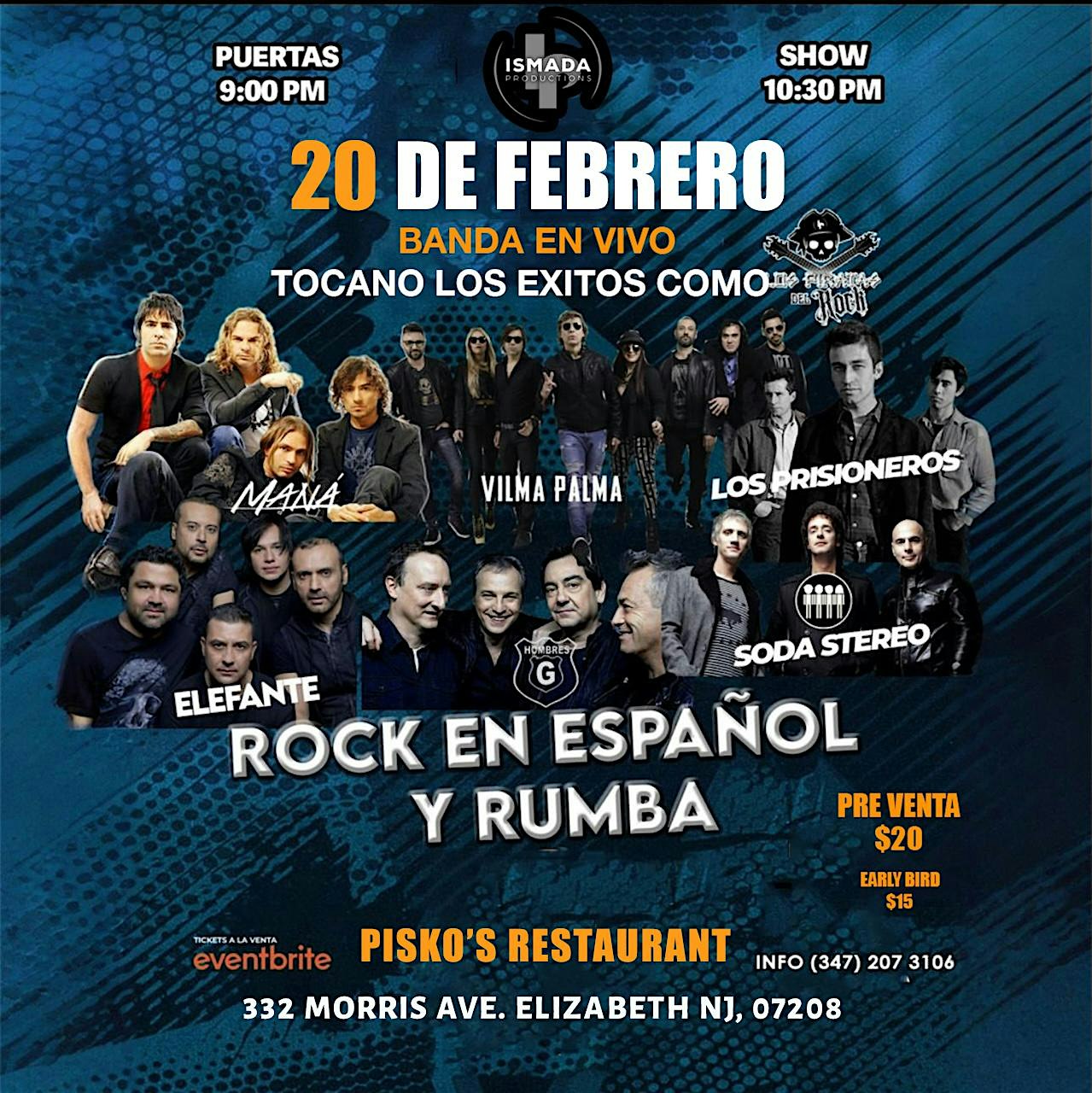 by admin12Feb Rock en español y rumba en NJ at Pisko’s – Elizabeth, NJ Rock en español y rumba en NJ at Pisko’s – Elizabeth, NJ 2 2 people viewed this event. “Prepárate para rockear con tus canciones favoritas en español y bailar toda la noche: será una fiesta que no te puedes perder. Tickets-RSVP Link Date And Time Saturday, February 21st, 2026 02:00 AM (PST) Venue Pisko's Location 332 Morris Avenue, Elizabeth, NJ 7208 Event Types Concert or PerformanceMusic Event Category New Jersey Share With Friends Facebook Twitter Linkedin Xing Pinterest Share This Post: