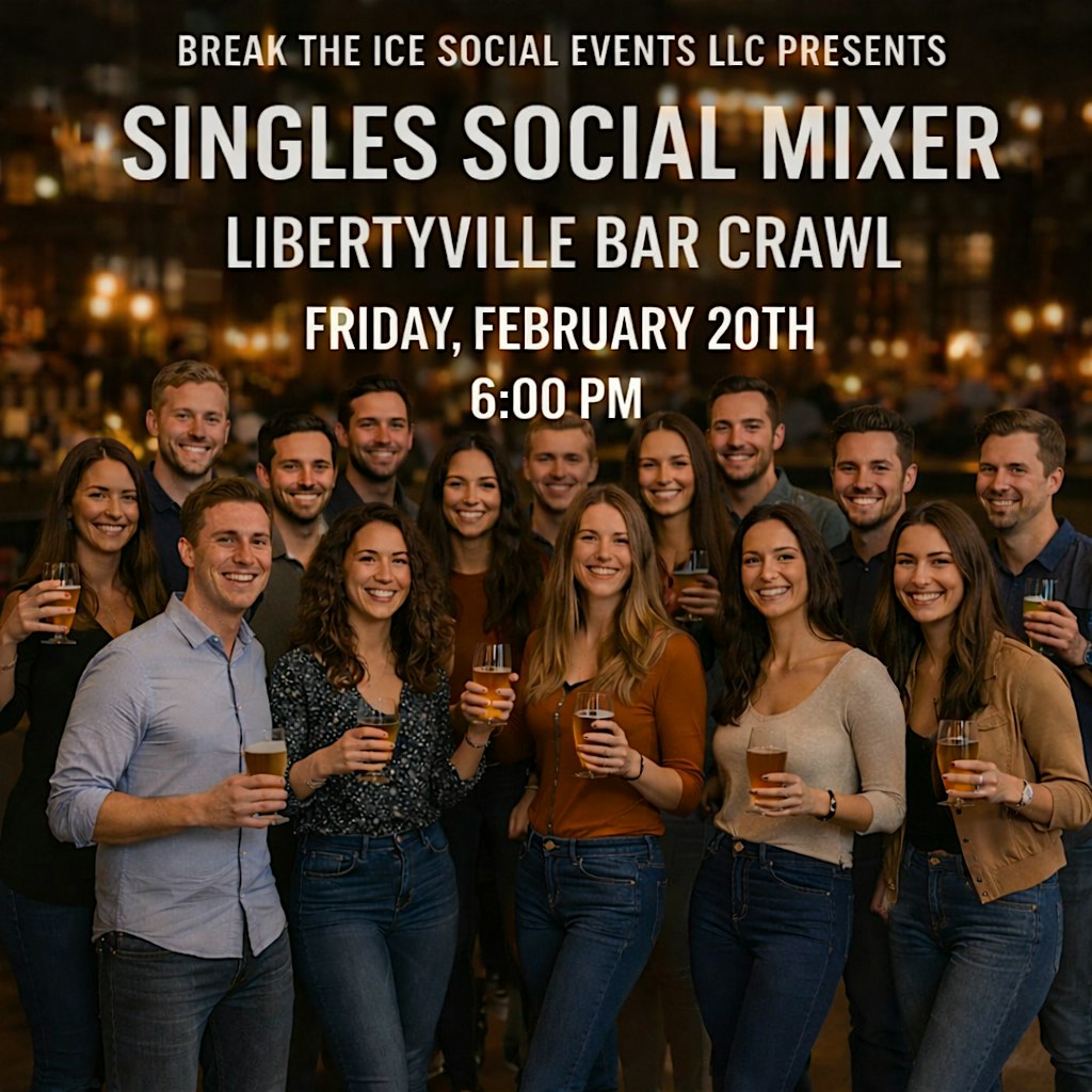 by admin12Feb Singles Social Mixer Libertyville, IL Bar Crawl Starting at Morgan’s at Morgan’s Bar & Grill – Libertyville, IL Singles Social Mixer Libertyville, IL Bar Crawl Starting at Morgan’s at Morgan’s Bar & Grill – Libertyville, IL 5 5 people viewed this event. Join us for a Libertyville, IL bar Crawl. It is recommended to get to Morgan’s before 7. If not view the crawl schedule below . Tickets-RSVP Link Date And Time Saturday, February 21st, 2026 12:00 AM (PST) Venue Morgan's Bar & Grill Location 532 North Milwaukee Avenue, Libertyville, IL 60048 Event Types Food & DrinkParty or Social Gathering Event Category Illinois Share With Friends Facebook Twitter Linkedin Xing Pinterest Share This Post: