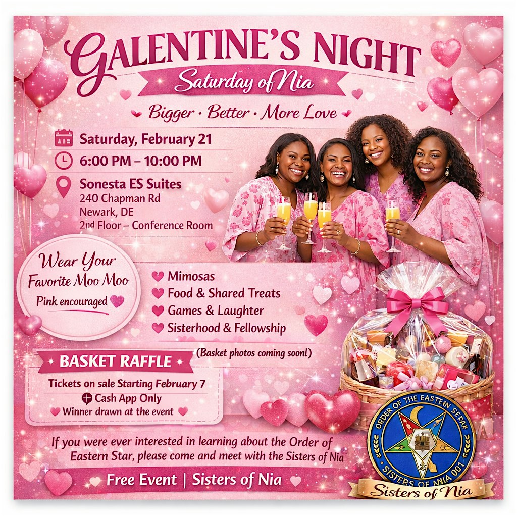 by admin12Feb Sisters of Nia shades of pink Galentine at Sonesta ES Suites Wilmington – Newark – Newark, DE Sisters of Nia shades of pink Galentine at Sonesta ES Suites Wilmington – Newark – Newark, DE 4 4 people viewed this event. this is a free event to come have fun with the Sisters of Nia wear a moo moo bring an item to share and be ready to have loads of fun Tickets-RSVP Link Date And Time Saturday, February 21st, 2026 11:00 PM (PST) Venue Sonesta ES Suites Wilmington - Newark Location 240 Chapman Road, Newark, DE 19702 Event Types Community & CultureParty or Social Gathering Event Category Delaware Share With Friends Facebook Twitter Linkedin Xing Pinterest Share This Post: