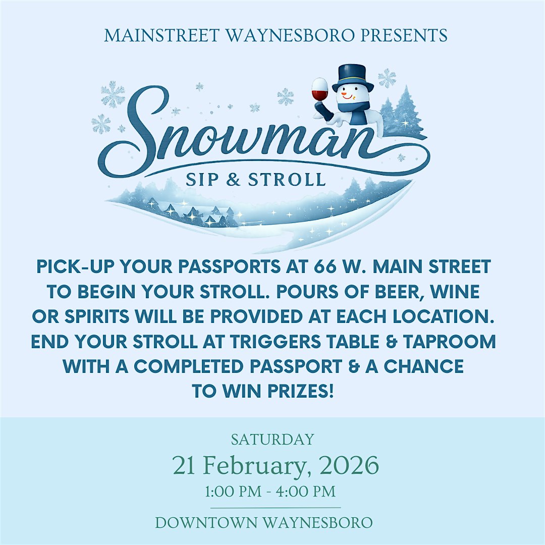 by admin12Feb Snowman Sip & Stroll at 66 W Main St – Waynesboro, PA Snowman Sip & Stroll at 66 W Main St – Waynesboro, PA 1 1 people viewed this event. Join us downtown for an afternoon tasting local brews, wines & spirits while supporting our local downtown shops! Tickets-RSVP Link Date And Time Saturday, February 21st, 2026 06:00 PM (PST) Venue 66 W Main St Location 66 West Main Street, Waynesboro, PA 17268 Event Types Festival or FairFood & Drink Event Category Pennsylvania Share With Friends Facebook Twitter Linkedin Xing Pinterest Share This Post: