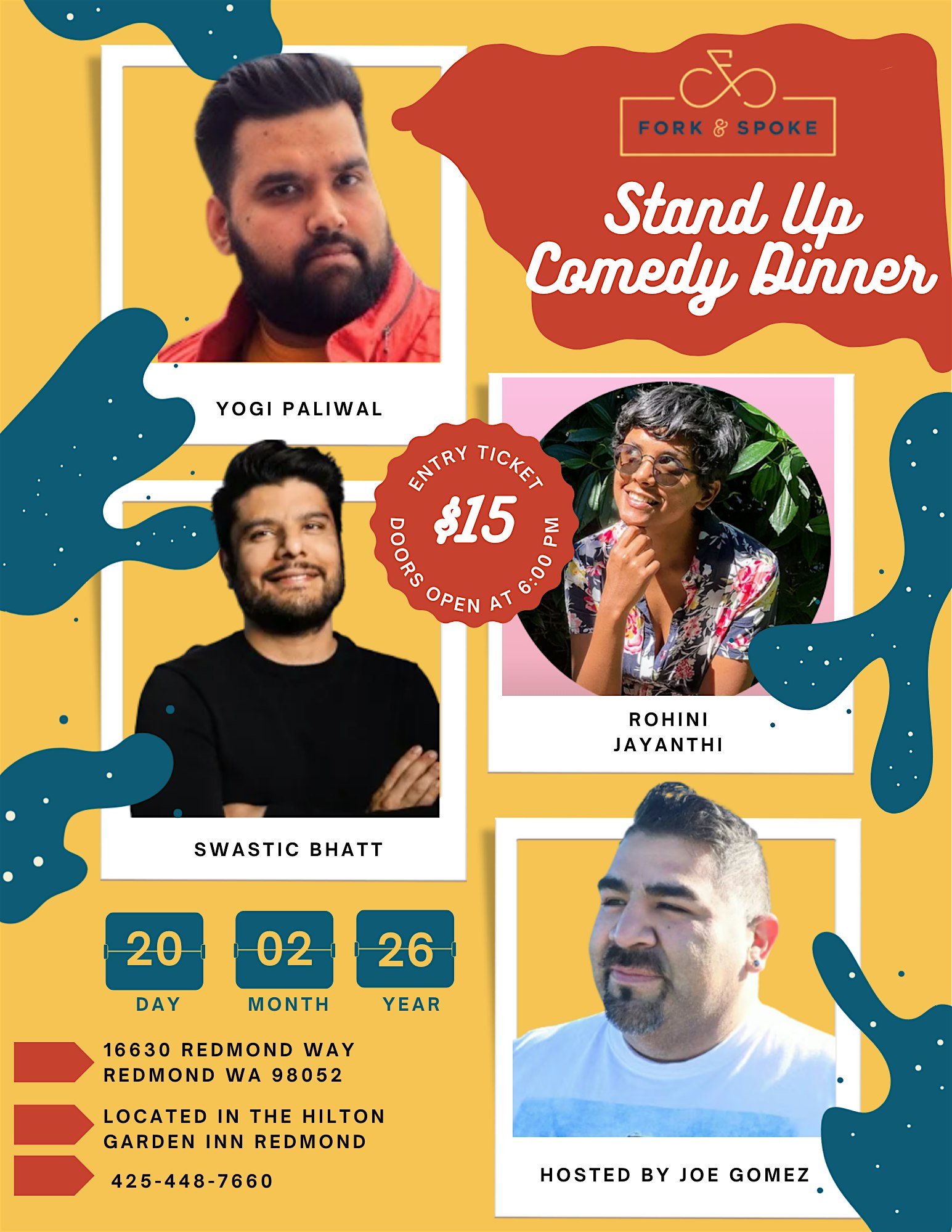 by admin12Feb Stand Up Comedy Dinner @ Fork & Spoke at Fork & Spoke Restaurant located in Hilton Garden Inn Redmond – Redmond, WA Stand Up Comedy Dinner @ Fork & Spoke at Fork & Spoke Restaurant located in Hilton Garden Inn Redmond – Redmond, WA 1 1 people viewed this event. We’ll feed you. They’ll roast you (lovingly). Stand-up comedy meets crave-worthy bites at the Fork & Spoke Comedy Show Dinner. Tickets-RSVP Link Date And Time Saturday, February 21st, 2026 02:00 AM (PST) Venue Fork & Spoke Restaurant located in Hilton Garden Inn Redmond Location 16630 Redmond Way, Redmond, WA 98052 Event Types Concert or PerformanceFilm, Media & Entertainment Event Category Washington Share With Friends Facebook Twitter Linkedin Xing Pinterest Share This Post: