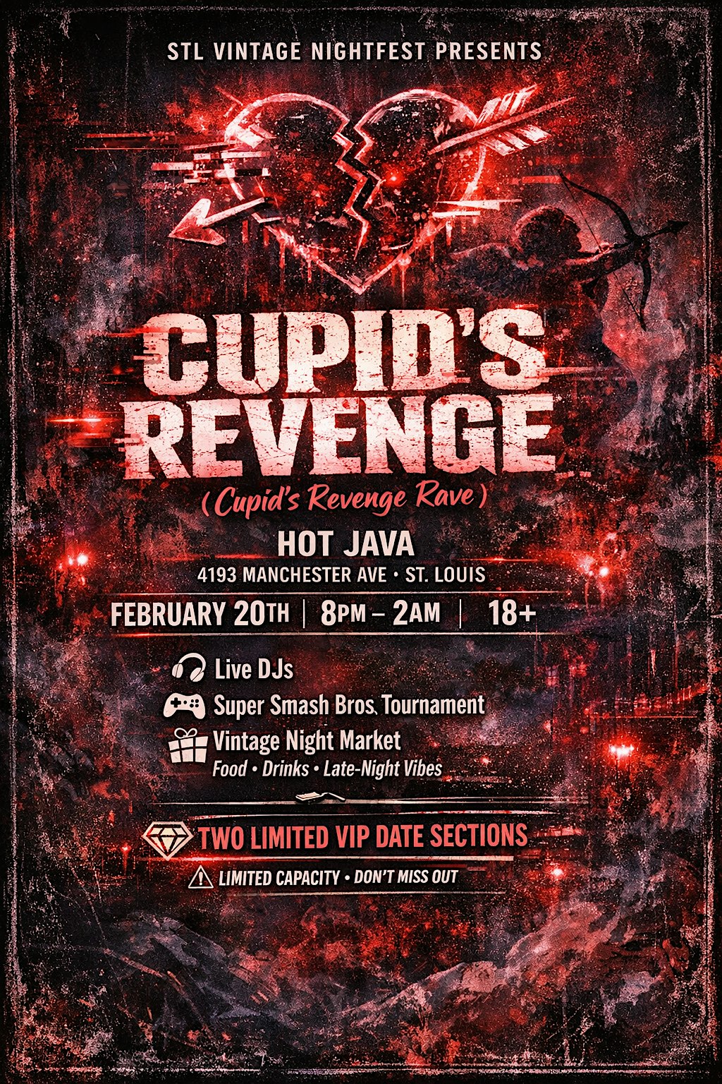 by admin12Feb STL Vintage Nightfest Cupid’s Revenge at 4193 Manchester Ave – St. Louis, MO STL Vintage Nightfest Cupid’s Revenge at 4193 Manchester Ave – St. Louis, MO 5 5 people viewed this event. Get ready for a blast from the past with STL Vintage Nightfest Cupid’s Revenge, where love meets retro vibes in the heart of the city. Tickets-RSVP Link Date And Time Saturday, February 21st, 2026 01:00 AM (PST) Venue 4193 Manchester Ave Location 4193 Manchester Avenue, St. Louis, MO 63110 Event Types Community & CultureParty or Social Gathering Event Category MissouriSt. Louis Share With Friends Facebook Twitter Linkedin Xing Pinterest Share This Post: