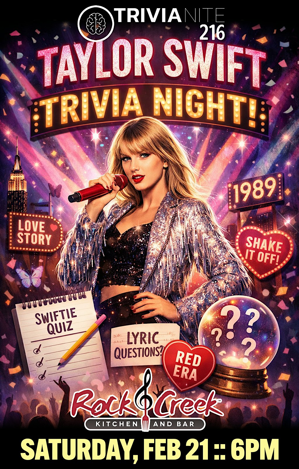 by admin13Feb Taylor Swift Trivia at Rock Creek Kitchen + Bar at Rock Creek Kitchen & Bar – Middleburg Heights, OH Taylor Swift Trivia at Rock Creek Kitchen + Bar at Rock Creek Kitchen & Bar – Middleburg Heights, OH 1 1 people viewed this event. From Debut to Midnights, deep cuts to chart-toppers — it’s time to prove you know your Taylor lore. Tickets-RSVP Link Date And Time Saturday, February 21st, 2026 11:00 PM (PST) Venue Rock Creek Kitchen & Bar Location 7768 West 130th Street, Middleburg Heights, OH 44130 Event Types Music Event Category Ohio Share With Friends Facebook Twitter Linkedin Xing Pinterest Share This Post: