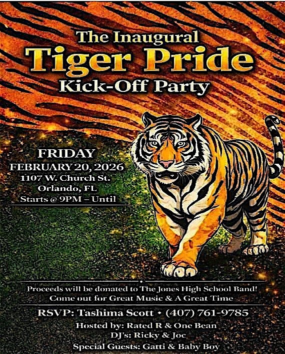by admin13Feb The Inaugural Tiger Pride Kick-Off Party at 1107 W Church St – Orlando, FL The Inaugural Tiger Pride Kick-Off Party at 1107 W Church St – Orlando, FL 2 2 people viewed this event. Hosted by: Rated R & One Bean| DJ’s Ricky & Joc| Special Guest: Gatti & Baby Boy| Incredible Time & Great Music! Tickets-RSVP Link Date And Time Saturday, February 21st, 2026 02:00 AM (PST) Venue 1107 W Church St Location 1107 West Church Street, Orlando, FL 32805 Event Types MusicParty or Social Gathering Event Category FloridaOrlando Share With Friends Facebook Twitter Linkedin Xing Pinterest Share This Post: