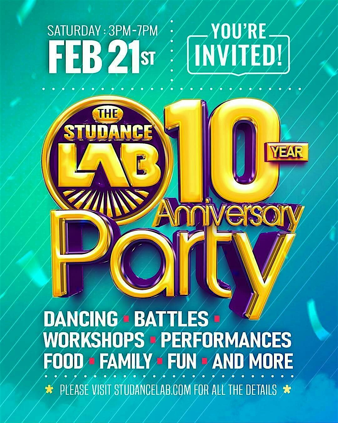Join us for The Studance Lab’s 10-year celebration. FREE. Dance classes , Battles, Food Trucks, Bounce Houses and more!