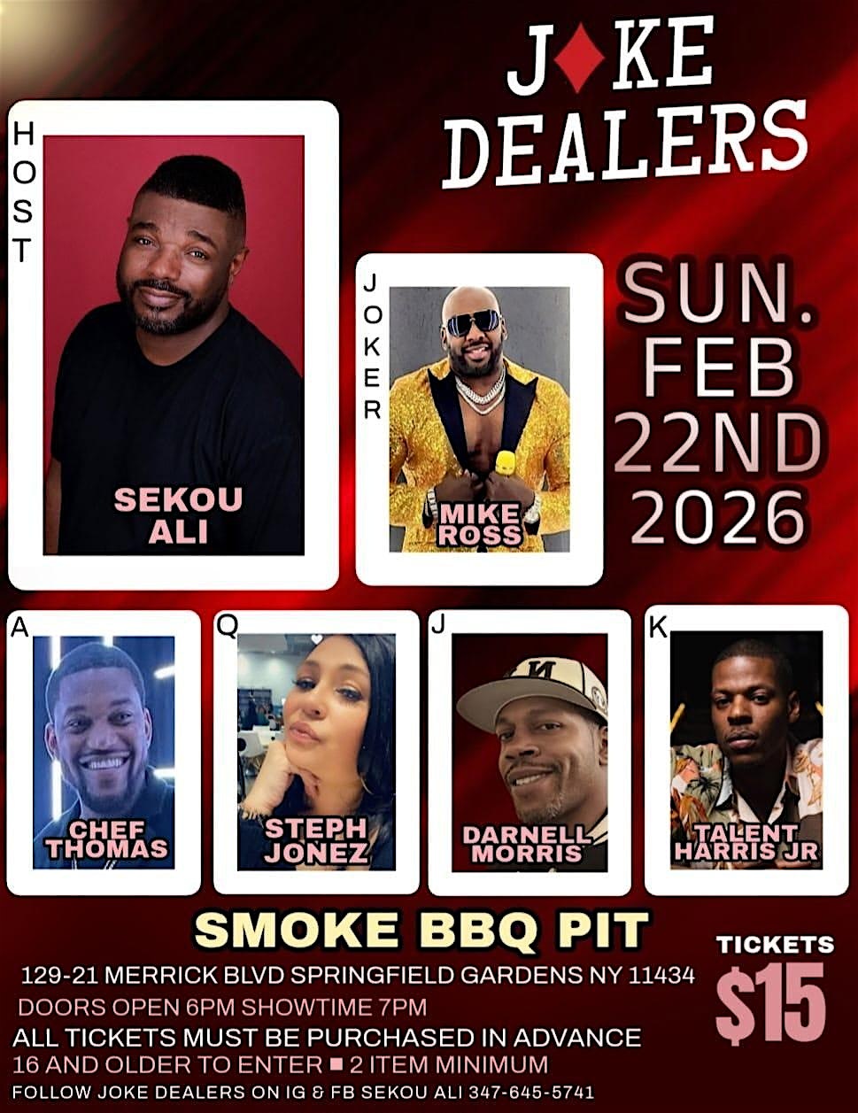 by admin13Feb 2/22/26 JOKE DEALERS at Smoke BBQ Pit – Queens, NY 2/22/26 JOKE DEALERS at Smoke BBQ Pit – Queens, NY 1 1 people viewed this event. Get ready to laugh your socks off at Joke Dealers, the ultimate live comedy show where hilarious comedians will leave you in stitches!!! Tickets-RSVP Link Date And Time Sunday, February 22nd, 2026 11:00 PM (PST) Venue Smoke BBQ Pit Location 129-21 Merrick Boulevard, Queens, NY 11434 Event Types Concert or PerformancePerforming & Visual Arts Event Category New YorkNew York City Share With Friends Facebook Twitter Linkedin Xing Pinterest Share This Post: