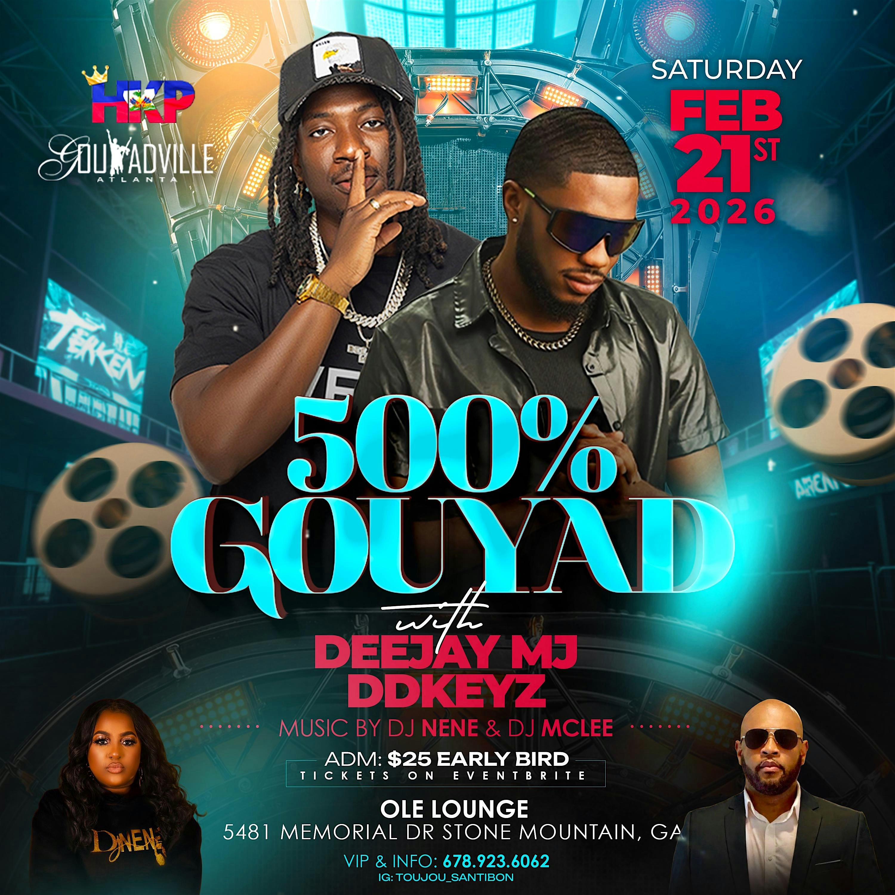 by admin12Feb 500% Gouyad With DEEJAY MJ | DDKEYZ |DJNEE | DJMCLEE at Ole Restaurant & Lounge – Stone Mountain, GA 500% Gouyad With DEEJAY MJ | DDKEYZ |DJNEE | DJMCLEE at Ole Restaurant & Lounge – Stone Mountain, GA 4 4 people viewed this event. GET READY TO ALL NIGHT LONG WITH THE HOTTEST GOUYAD BEATS FROM DEEJAY MJ, DDKEYZ, DJNEE, and DJMCLEE! 500% GOUYAD ALL NIGHT LONG!! Tickets-RSVP Link Date And Time Sunday, February 22nd, 2026 03:00 AM (PST) Venue Ole Restaurant & Lounge Location 5481 Memorial Drive, Stone Mountain, GA 30083 Event Types MusicParty or Social Gathering Event Category Georgia Share With Friends Facebook Twitter Linkedin Xing Pinterest Share This Post: