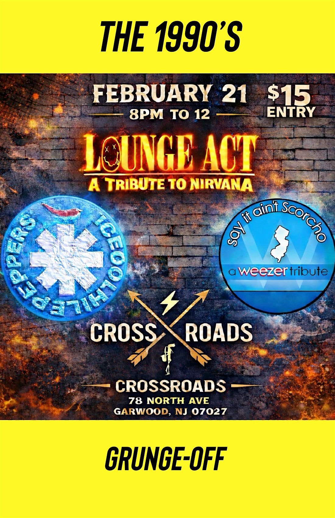 by admin12Feb 90’s GrungeOff w/ Tributes to Nirvana, Red Hot Chili Peppers, & Weezer at Crossroads – Garwood, NJ 90’s GrungeOff w/ Tributes to Nirvana, Red Hot Chili Peppers, & Weezer at Crossroads – Garwood, NJ 5 5 people viewed this event. 21+ Tickets-RSVP Link Date And Time Sunday, February 22nd, 2026 01:00 AM (PST) Venue Crossroads Location 78 North ave, Garwood, NJ 7027 Event Types Concert or PerformanceMusic Event Category New BrunswickNew Jersey Share With Friends Facebook Twitter Linkedin Xing Pinterest Share This Post: