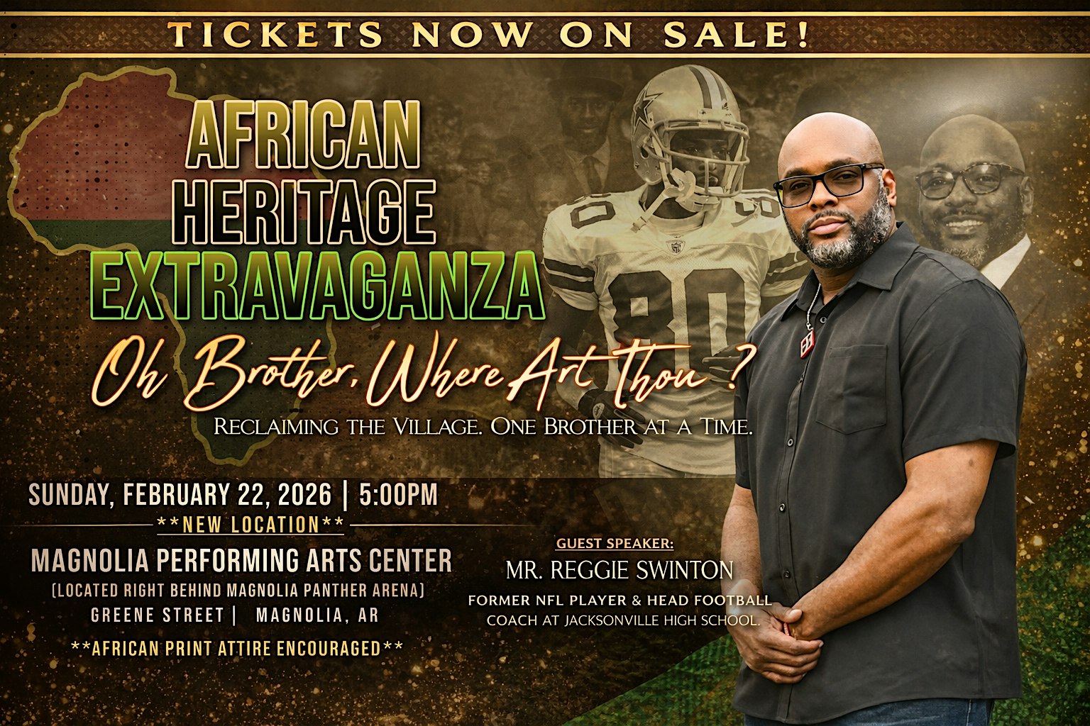 by admin12Feb African Heritage Extravaganza at PERFORMING ARTS CENTER – Magnolia, AR African Heritage Extravaganza at PERFORMING ARTS CENTER – Magnolia, AR 6 6 people viewed this event. Join us for the African Heritage Extravaganza, a vibrant in-person celebration of culture, music, and food! Tickets-RSVP Link Date And Time Sunday, February 22nd, 2026 11:00 PM (PST) Venue PERFORMING ARTS CENTER Location Greene Street, Magnolia, AR 71753 Event Types Community & CultureFestival or Fair Event Category Arkansas Share With Friends Facebook Twitter Linkedin Xing Pinterest Share This Post: