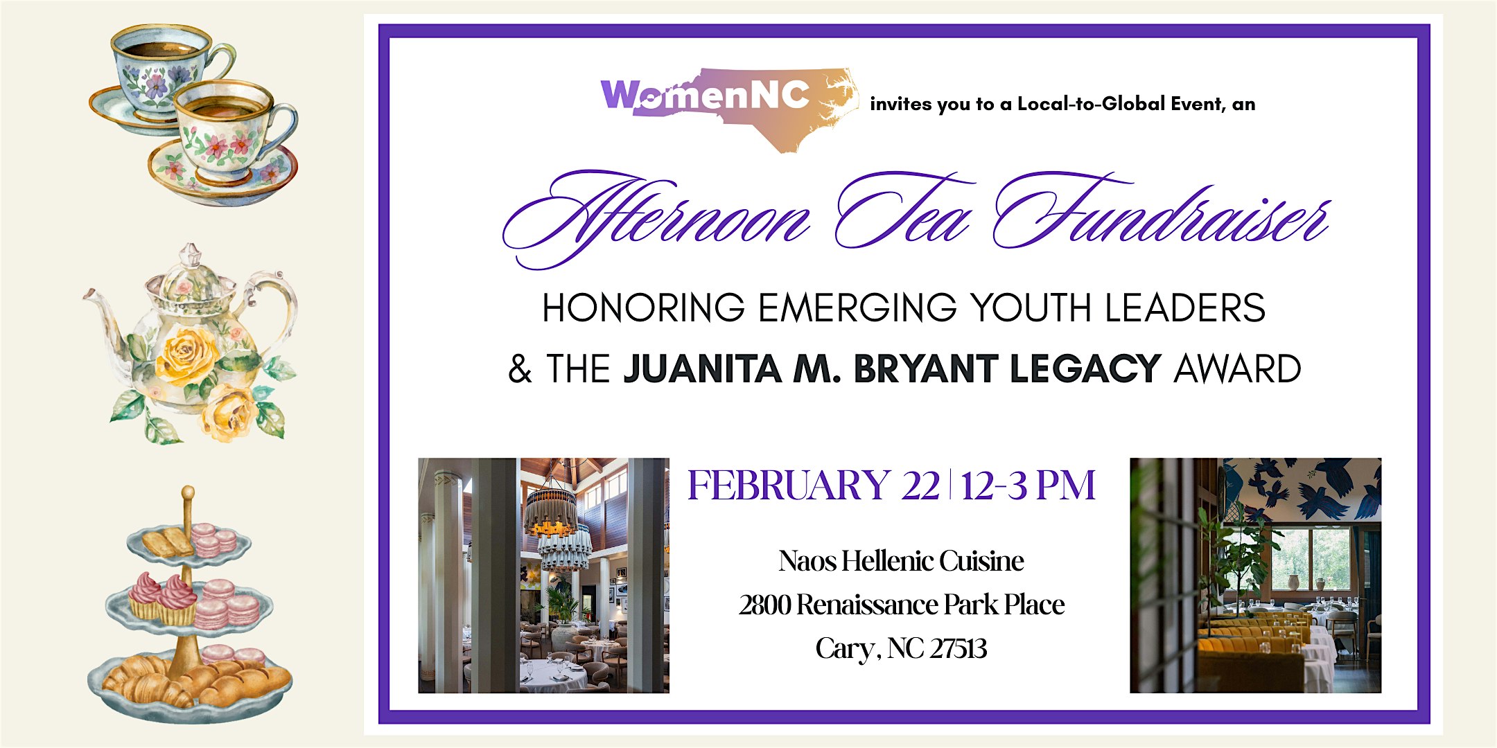 by admin12Feb An Afternoon Tea Fundraiser Honoring Emerging Youth Leaders at Naos Hellenic Cuisine – Cary, NC An Afternoon Tea Fundraiser Honoring Emerging Youth Leaders at Naos Hellenic Cuisine – Cary, NC 4 4 people viewed this event. Join us for a local-to-global tea with student presentations, awards ceremony, silent auction, entertainment, and community connection. Tickets-RSVP Link Date And Time Sunday, February 22nd, 2026 05:00 PM (PST) Venue Naos Hellenic Cuisine Location 2800 Renaissance Park Place, Cary, NC 27513 Event Types Community & Culture Event Category North Carolina Share With Friends Facebook Twitter Linkedin Xing Pinterest Share This Post: