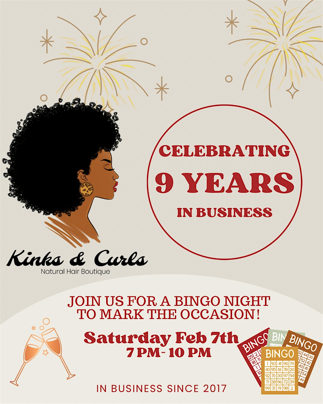 by admin12Feb Bingo, Beauty & Bubbles at Kinks and Curls Natural Hair Boutique – Lawrenceville, GA Bingo, Beauty & Bubbles at Kinks and Curls Natural Hair Boutique – Lawrenceville, GA 5 5 people viewed this event. Celebrating 9 years with Bingo, prizes, and good vibes! Come party with us and help us mark the milestone. Tickets-RSVP Link Date And Time Sunday, February 22nd, 2026 12:00 AM (PST) Venue Kinks and Curls Natural Hair Boutique Location 3157 Sugarloaf Parkway, Lawrenceville, GA 30045 Event Types Community & CultureParty or Social Gathering Event Category Georgia Share With Friends Facebook Twitter Linkedin Xing Pinterest Share This Post: