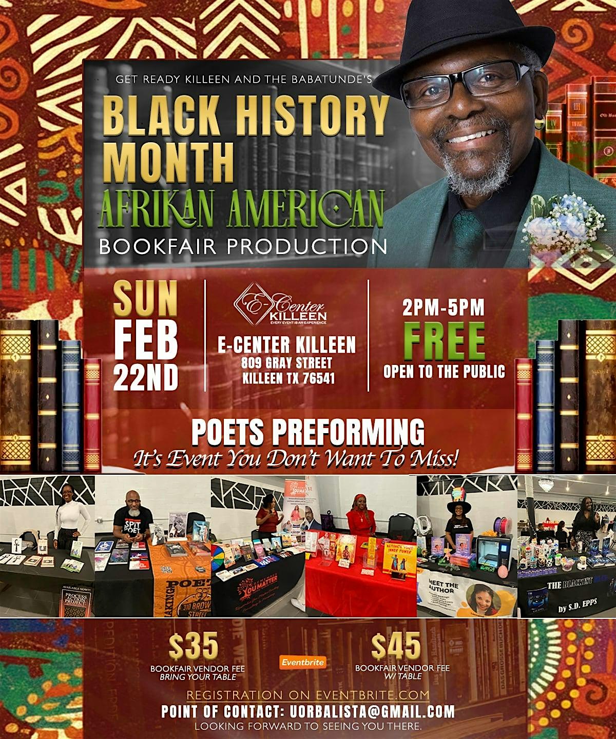 by admin13Feb Black History Month African American Book Fair at ECenter Killeen – Killeen, TX Black History Month African American Book Fair at ECenter Killeen – Killeen, TX 2 2 people viewed this event. Come visit the African American Black History Book Fair at the E Center Killeen Tickets-RSVP Link Date And Time Sunday, February 22nd, 2026 08:00 PM (PST) Venue ECenter Killeen Location 809 North Gray Street, Killeen, TX 76541 Event Types Community & CultureFestival or Fair Event Category Texas Share With Friends Facebook Twitter Linkedin Xing Pinterest Share This Post: