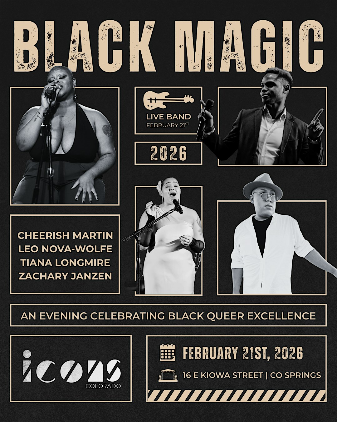 by admin12Feb BLACK MAGIC – Cheerish / Tiana / Leo / Zachary with a Live Band! at 16 E Kiowa St – Colorado Springs, CO BLACK MAGIC – Cheerish / Tiana / Leo / Zachary with a Live Band! at 16 E Kiowa St – Colorado Springs, CO 6 6 people viewed this event. A part of our BLACK MAGIC weekend – join Cheerish, Tiana, Leo, and Zachary for an incredible evening of live music! Tickets-RSVP Link Date And Time Sunday, February 22nd, 2026 02:00 AM (PST) Venue 16 E Kiowa St Location 16 East Kiowa Street, Colorado Springs, CO 80903 Event Types Concert or PerformanceMusic Event Category ColoradoColorado Springs Share With Friends Facebook Twitter Linkedin Xing Pinterest Share This Post: