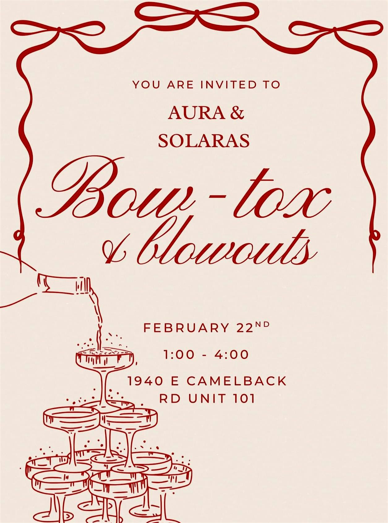 by admin13Feb Bow-Tox and Blowouts at Aura beauty salon – Phoenix, AZ Bow-Tox and Blowouts at Aura beauty salon – Phoenix, AZ 2 2 people viewed this event. Blowouts, Botox & beauty deals ! Grab your glam spot at Aura beauty salon HOSTED BY AURA SALON AND SOLARA HEALTH AND BEAUTY Tickets-RSVP Link Date And Time Sunday, February 22nd, 2026 08:00 PM (PST) Venue Aura beauty salon Location 1940 East Camelback Road, Phoenix, AZ 85016 Event Types Fashion & BeautyParty or Social Gathering Event Category ArizonaPhoenix Share With Friends Facebook Twitter Linkedin Xing Pinterest Share This Post: