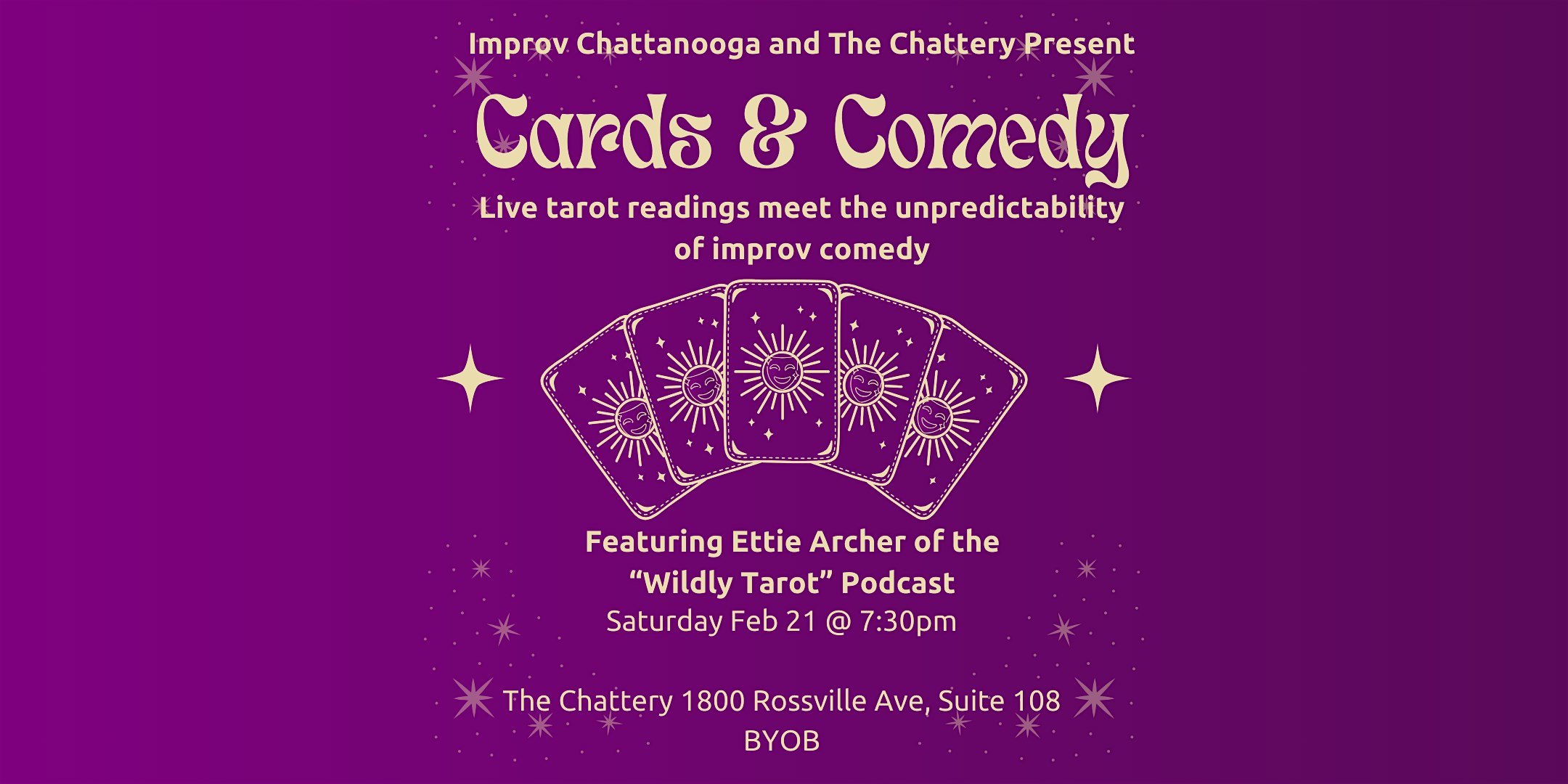 by admin12Feb Cards & Comedy: Live Improv Show at The Chattery at The Chattery – Chattanooga, TN Cards & Comedy: Live Improv Show at The Chattery at The Chattery – Chattanooga, TN 3 3 people viewed this event. Live tarot readings meet the unpredictability of improv comedy! Tickets-RSVP Link Date And Time Sunday, February 22nd, 2026 12:00 AM (PST) Venue The Chattery Location 1800 Rossville Avenue, Chattanooga, TN 37408 Event Types Concert or PerformancePerforming & Visual Arts Event Category ChattanoogaTennessee Share With Friends Facebook Twitter Linkedin Xing Pinterest Share This Post: