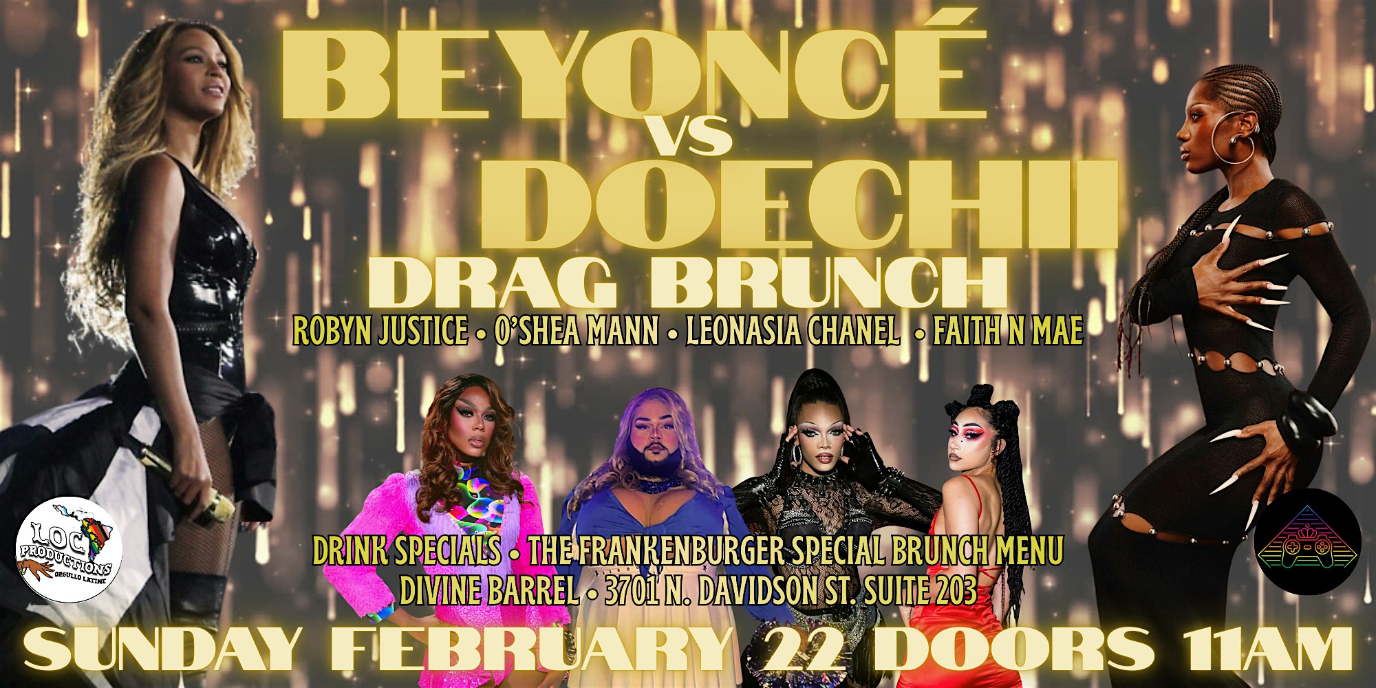 by admin12Feb CGN Presents: Beyonce vs Doechii Drag Brunch at Divine Barrel Brewing – Charlotte, NC CGN Presents: Beyonce vs Doechii Drag Brunch at Divine Barrel Brewing – Charlotte, NC 4 4 people viewed this event. Join us for our monthly CGN drag brunch, co-produced by Charlotte Gaymers Network and LOC Productions Tickets-RSVP Link Date And Time Sunday, February 22nd, 2026 04:00 PM (PST) Venue Divine Barrel Brewing Location 3701 North Davidson Street, Charlotte, NC 28205 Event Types Community & Culture Event Category CharlotteNorth Carolina Share With Friends Facebook Twitter Linkedin Xing Pinterest Share This Post: