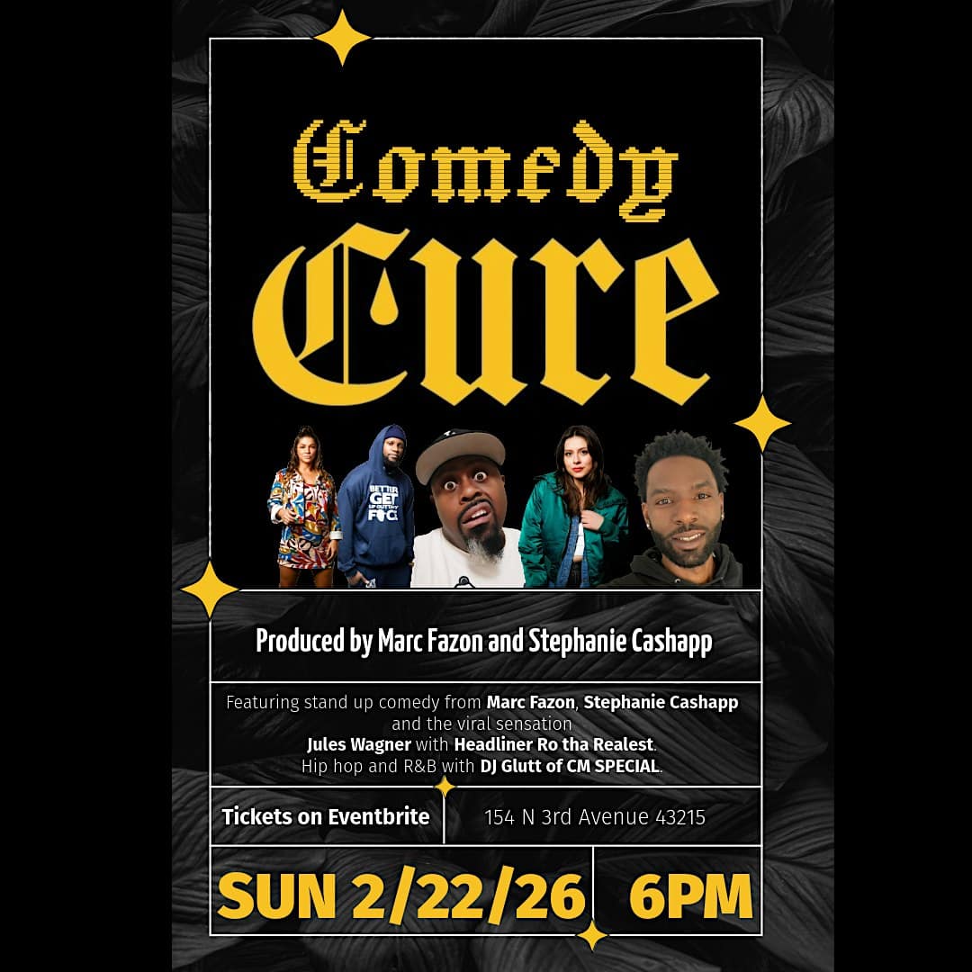 by admin14Feb Comedy Cure at Cure Coffee and Cocktails – Columbus, OH Comedy Cure at Cure Coffee and Cocktails – Columbus, OH 2 2 people viewed this event. Produced by Stephanie Cashapp & Marc Fazon, Featuring Jules Wagner, Headlining Ro tha Realest with music by DJ Glutt Tickets-RSVP Link Date And Time Sunday, February 22nd, 2026 11:00 PM (PST) Venue Cure Coffee and Cocktails Location 154 North 3rd Street, Columbus, OH 43215 Event Types Charity & CausesConcert or Performance Event Category Ohio Share With Friends Facebook Twitter Linkedin Xing Pinterest Share This Post: