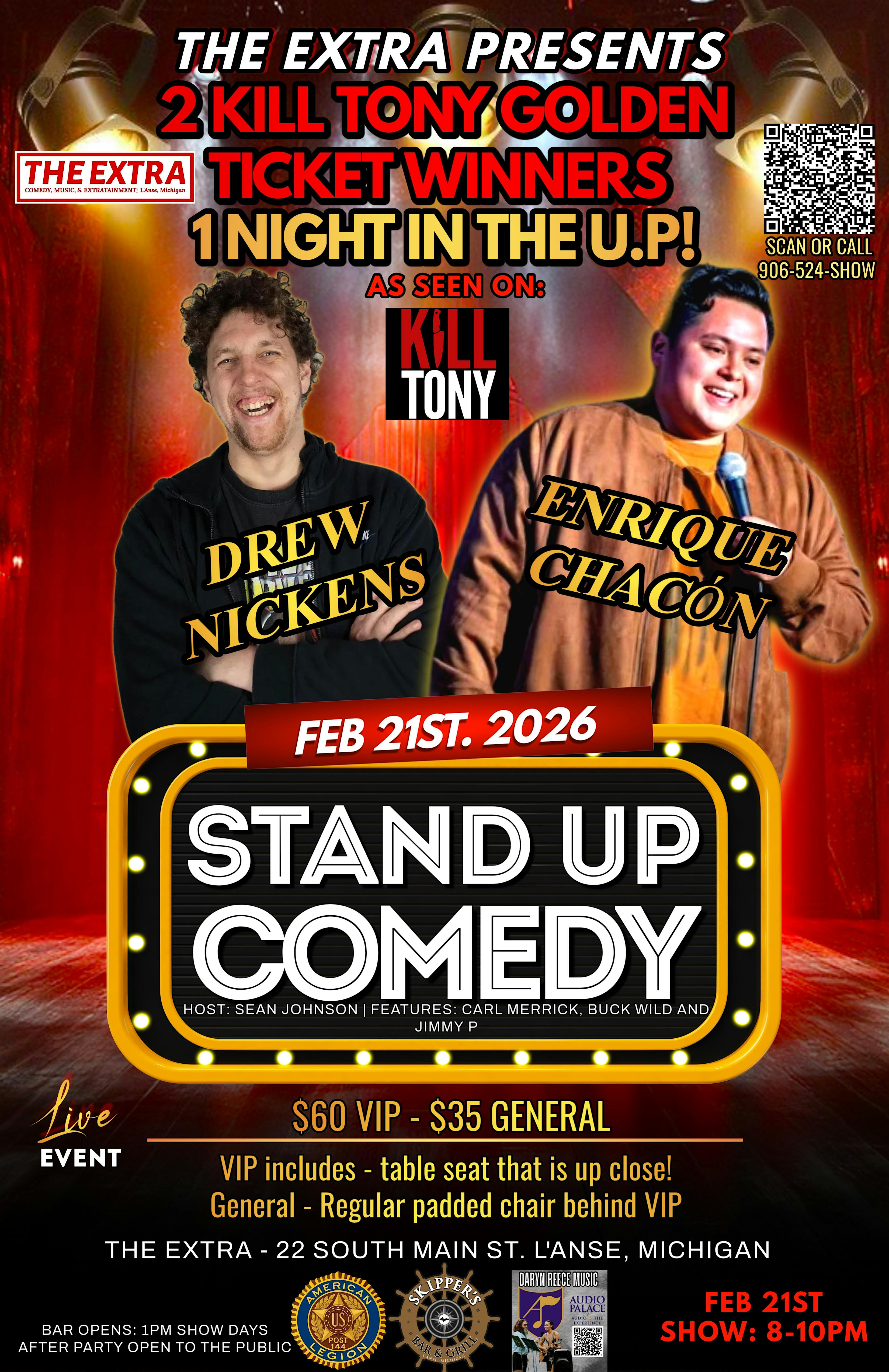 by admin12Feb Comedy Extra Kill Tony Golden Ticket Winners Enrique Chacón & Drew Nickens at 22 South Main Street, L’Anse, MI, USA – L’Anse, MI Comedy Extra Kill Tony Golden Ticket Winners Enrique Chacón & Drew Nickens at 22 South Main Street, L’Anse, MI, USA – L’Anse, MI 3 3 people viewed this event. Two of Kill Tony’s funniest Golden Ticket winners are teaming up for one unforgettable night of stand-up at The Extra! Tickets-RSVP Link Date And Time Sunday, February 22nd, 2026 12:00 AM (PST) Venue 22 South Main Street, L'Anse, MI, USA Location 22 South Main Street, L'Anse, MI 49946 Event Types Concert or PerformancePerforming & Visual Arts Event Category Michigan Share With Friends Facebook Twitter Linkedin Xing Pinterest Share This Post: