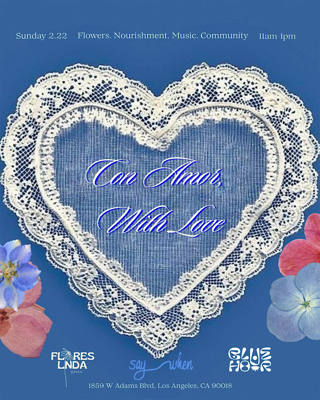 by admin13Feb Con Amor, With Love – Community Gathering at 1859 W Adams Blvd – Los Angeles, CA Con Amor, With Love – Community Gathering at 1859 W Adams Blvd – Los Angeles, CA 1 1 people viewed this event. Show up for the community – a wellness pop-up with a floral experience, nourishment by Blue Hour Goods, and music by DJ Weesnaw. Tickets-RSVP Link Date And Time Sunday, February 22nd, 2026 07:00 PM (PST) Venue 1859 W Adams Blvd Location 1859 West Adams Boulevard, Los Angeles, CA 90018 Event Types Party or Social Gathering Event Category CaliforniaLos Angeles Share With Friends Facebook Twitter Linkedin Xing Pinterest Share This Post: