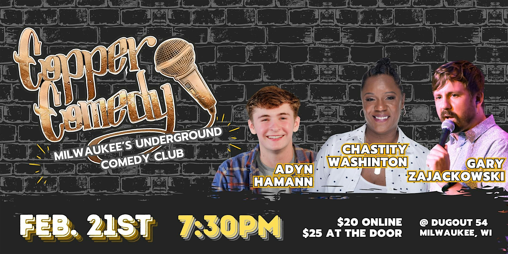 by admin12Feb Copper Comedy | Milwaukee’s Underground Comedy Club | Chastity Washington at Dugout 54 – Milwaukee, WI Copper Comedy | Milwaukee’s Underground Comedy Club | Chastity Washington at Dugout 54 – Milwaukee, WI 5 5 people viewed this event. Milwaukee’s Underground Comedy Club. Monthly Comedy Shows. Speak-Easy, Laugh Hard! Tickets-RSVP Link Date And Time Sunday, February 22nd, 2026 01:00 AM (PST) Venue Dugout 54 Location 5328 West Bluemound Road, Milwaukee, WI 53208 Event Types Concert or PerformancePerforming & Visual Arts Event Category MilwaukeeWisconsin Share With Friends Facebook Twitter Linkedin Xing Pinterest Share This Post: