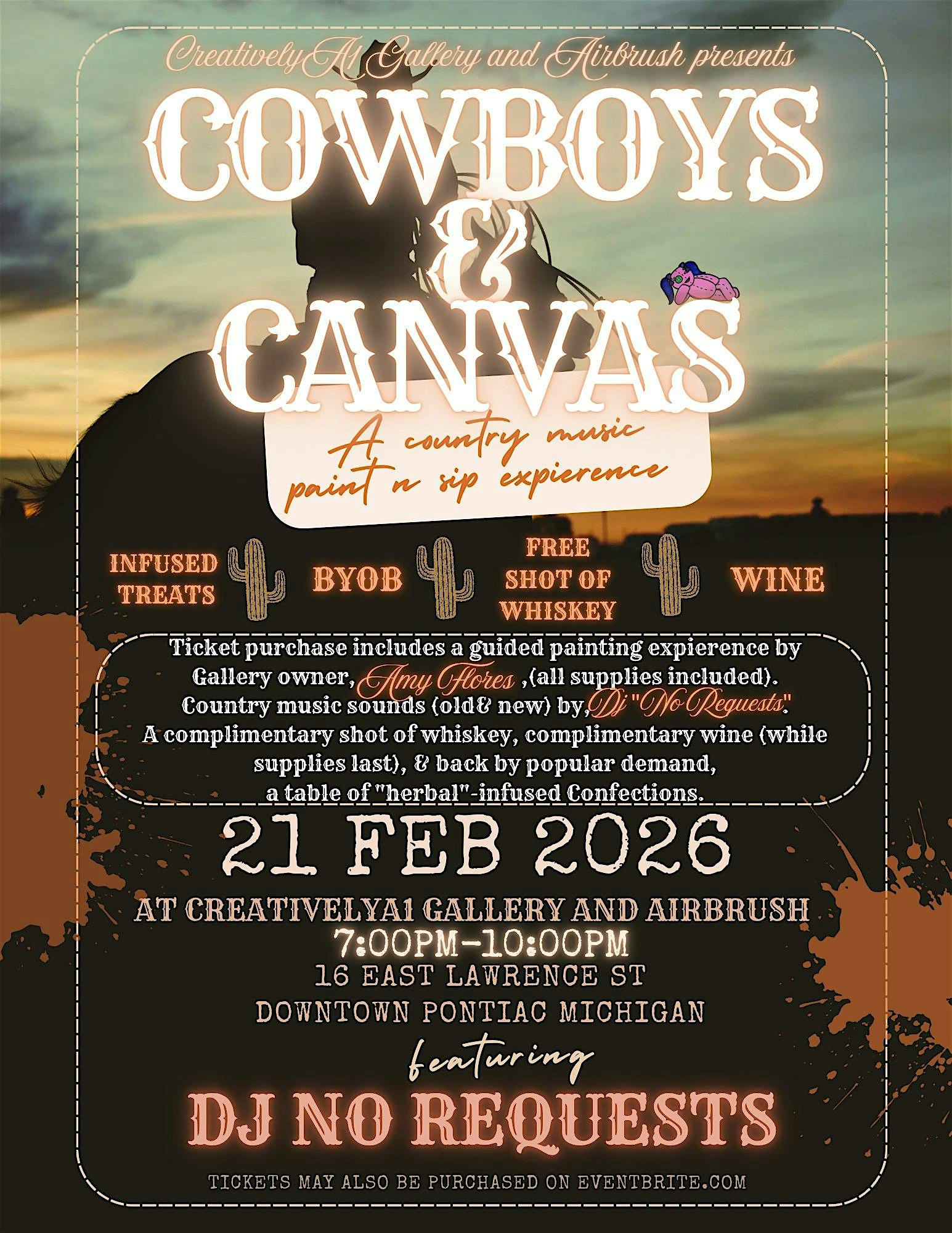 by admin12Feb Cowboys & Canvas , A Country Music Paint N Sip Expierence at CreativelyA1 Gallery and Airbrush – Pontiac, MI Cowboys & Canvas , A Country Music Paint N Sip Expierence at CreativelyA1 Gallery and Airbrush – Pontiac, MI 4 4 people viewed this event. Country music paint n sip expierence Tickets-RSVP Link Date And Time Sunday, February 22nd, 2026 12:00 AM (PST) Venue CreativelyA1 Gallery and Airbrush Location 16 East Lawrence Street, Pontiac, MI 48342 Event Types Community & CultureParty or Social Gathering Event Category Michigan Share With Friends Facebook Twitter Linkedin Xing Pinterest Share This Post: