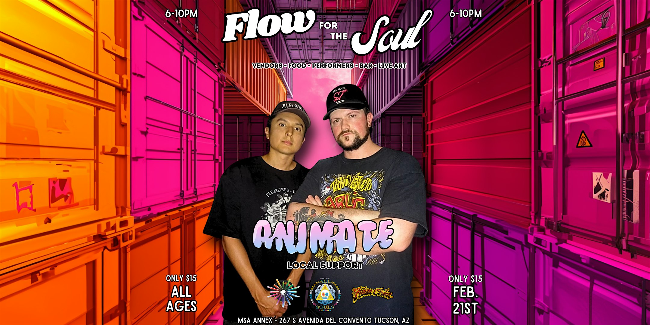 by admin12Feb Flow for the Soul – Animate at MSA Annex – Tucson, AZ Flow for the Soul – Animate at MSA Annex – Tucson, AZ 6 6 people viewed this event. Premier Mini-Fest Feat. Local Dj/Producers, Art, Performers, Vendors, Fire Art, and a Touring Headliner Every MONTH! Benefiting the ASP2026 Tickets-RSVP Link Date And Time Sunday, February 22nd, 2026 01:00 AM (PST) Venue MSA Annex Location 267 South Avenida del Convento, Tucson, AZ 85745 Event Types Concert or PerformancePerforming & Visual Arts Event Category ArizonaTucson Share With Friends Facebook Twitter Linkedin Xing Pinterest Share This Post: