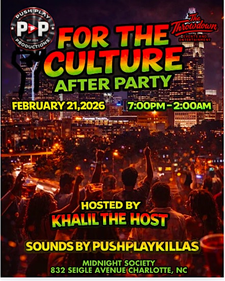 by admin13Feb For the Culture After Party at Midnight Society Cafe – Charlotte, NC For the Culture After Party at Midnight Society Cafe – Charlotte, NC 2 2 people viewed this event. Turn up and keep the vibes alive at the For the Culture After Party—where the real fun begins! Tickets-RSVP Link Date And Time Sunday, February 22nd, 2026 12:00 AM (PST) Venue Midnight Society Cafe Location 832 Seigle Avenue, Charlotte, NC 28204 Event Types Community & CultureParty or Social Gathering Event Category CharlotteNorth Carolina Share With Friends Facebook Twitter Linkedin Xing Pinterest Share This Post: