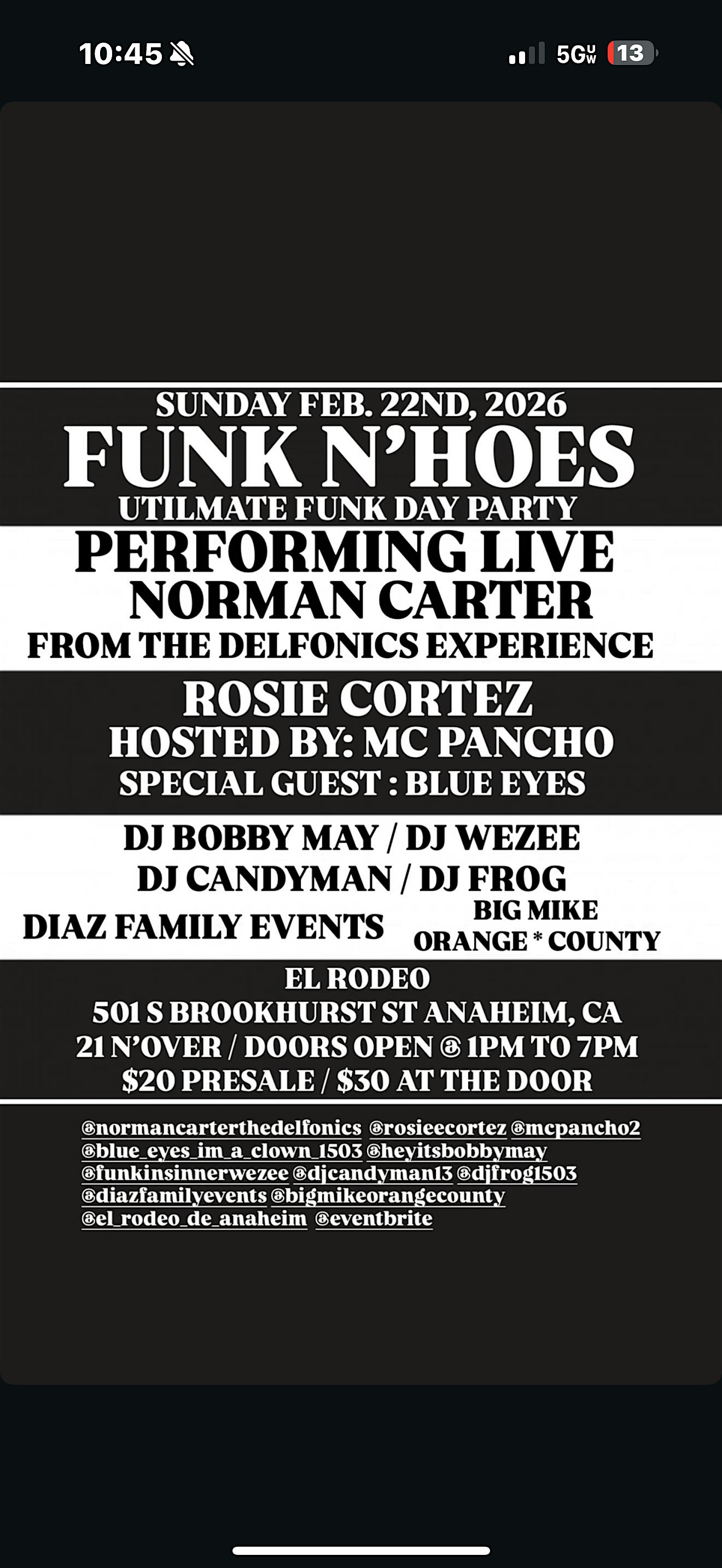 by admin12Feb FUNK N’HOES THE ULTIMATE FUNK DAY PARTY at 501 S Brookhurst St – Anaheim, CA FUNK N’HOES THE ULTIMATE FUNK DAY PARTY at 501 S Brookhurst St – Anaheim, CA 5 5 people viewed this event. GET READY TO BOOGIE AT FUNK N’ HOES PERFORMING LIVE NORMAN CARTER OF THE DELFONICS EXPERIENCE, ROSIE CORTEZ AND AN ALLSTAR DJ LINE UP! Tickets-RSVP Link Date And Time Sunday, February 22nd, 2026 09:00 PM (PST) Venue 501 S Brookhurst St Location 501 South Brookhurst Street, Anaheim, CA 92801 Event Types MusicParty or Social Gathering Event Category CaliforniaLos Angeles Share With Friends Facebook Twitter Linkedin Xing Pinterest Share This Post: