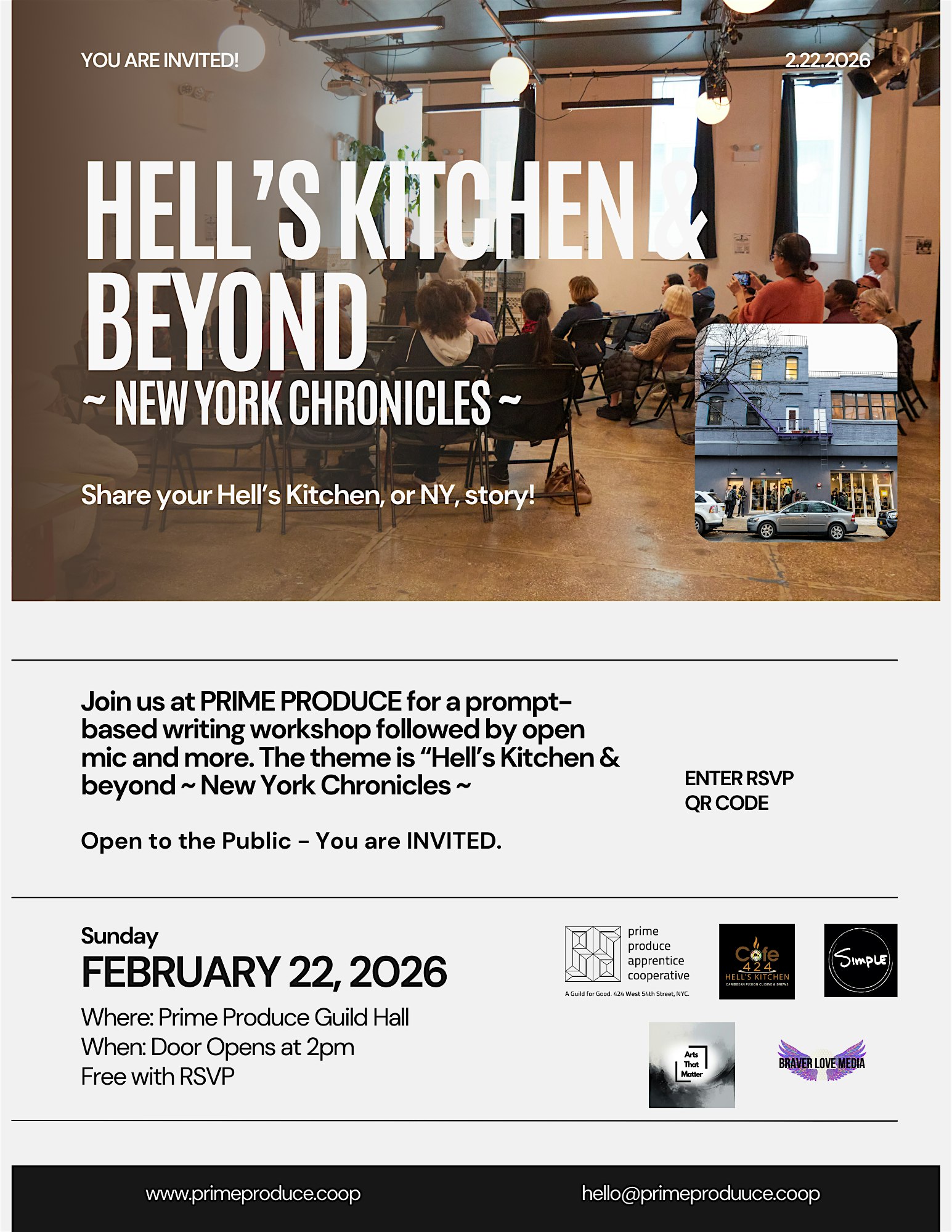 by admin12Feb Hell’s Kitchen & Beyond ~ New York Chronicles ~ at Prime Produce – New York, NY Hell’s Kitchen & Beyond ~ New York Chronicles ~ at Prime Produce – New York, NY 3 3 people viewed this event. Join us at PRIME PRODUCE for a prompt-based writing workshop followed by open mic and more. Tickets-RSVP Link Date And Time Sunday, February 22nd, 2026 07:00 PM (PST) Venue Prime Produce Location 424 West 54th Street, New York, NY 10019 Event Types Community & CultureParty or Social Gathering Event Category New YorkNew York City Share With Friends Facebook Twitter Linkedin Xing Pinterest Share This Post: