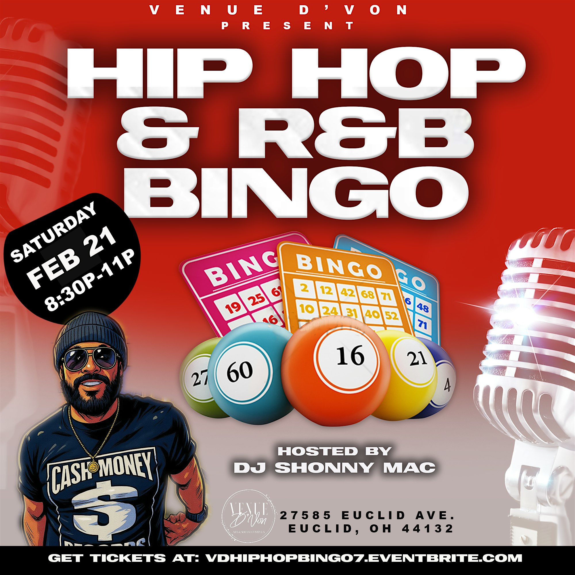 by admin12Feb Hip Hop & R&B Bingo at Venue D’Von – Euclid, OH Hip Hop & R&B Bingo at Venue D’Von – Euclid, OH 4 4 people viewed this event. Get ready to vibe with Hip Hop & R&B Bingo—where beats meet bingo for a night of fun and prizes! Tickets-RSVP Link Date And Time Sunday, February 22nd, 2026 01:00 AM (PST) Venue Venue D'Von Location 27585 Euclid Ave, Euclid, OH 44132 Event Types Music Event Category Ohio Share With Friends Facebook Twitter Linkedin Xing Pinterest Share This Post: