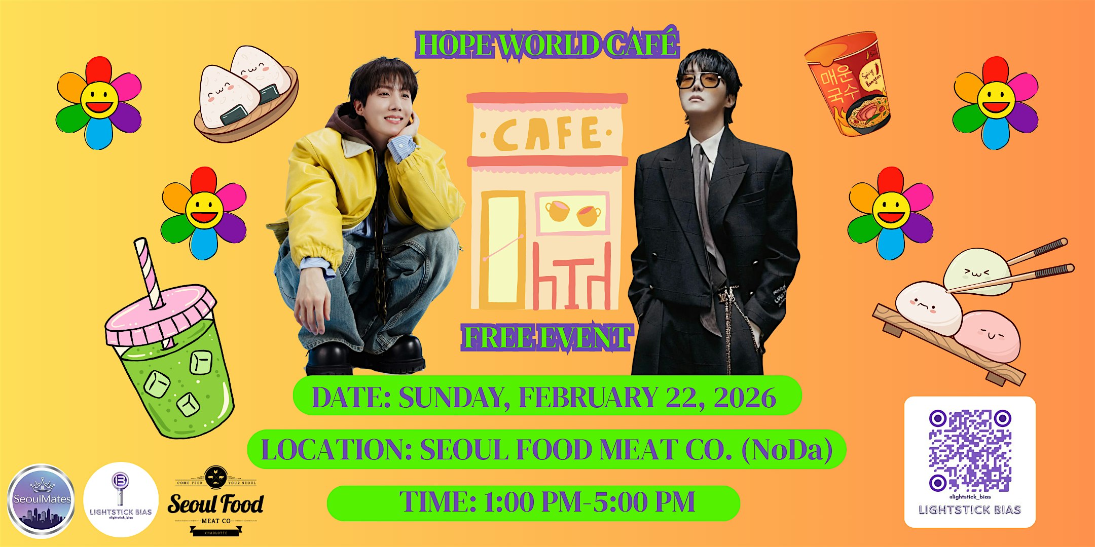 by admin12Feb Hope World Café Cupsleeve Event at Urban District Market – Charlotte, NC Hope World Café Cupsleeve Event at Urban District Market – Charlotte, NC 3 3 people viewed this event. Calling all ARMY! Let’s celebrate our Dancing King, J-Hope’s birthday. Tickets-RSVP Link Date And Time Sunday, February 22nd, 2026 06:00 PM (PST) Venue Urban District Market Location 2315 North Davidson Street, Charlotte, NC 28205 Event Types OtherParty or Social Gathering Event Category CharlotteNorth Carolina Share With Friends Facebook Twitter Linkedin Xing Pinterest Share This Post: