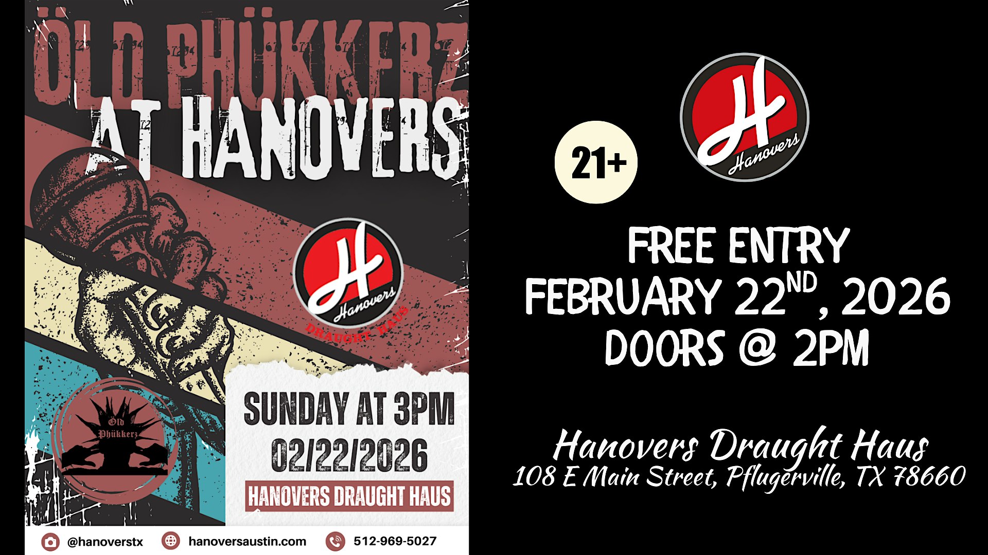 by admin13Feb Live Music Show with Öld Phükkerz at Hanovers Pflugerville at Hanovers Draught Haus – Pflugerville, TX Live Music Show with Öld Phükkerz at Hanovers Pflugerville at Hanovers Draught Haus – Pflugerville, TX 2 2 people viewed this event. It’s Sunday, but we’re turning it up with an unforgettable live music show. Whether you’re winding down the weekend or gearing up ahead! Tickets-RSVP Link Date And Time Sunday, February 22nd, 2026 09:00 PM (PST) Venue Hanovers Draught Haus Location 108 East Main Street, Pflugerville, TX 78660 Event Types Concert or PerformanceMusic Event Category Texas Share With Friends Facebook Twitter Linkedin Xing Pinterest Share This Post: