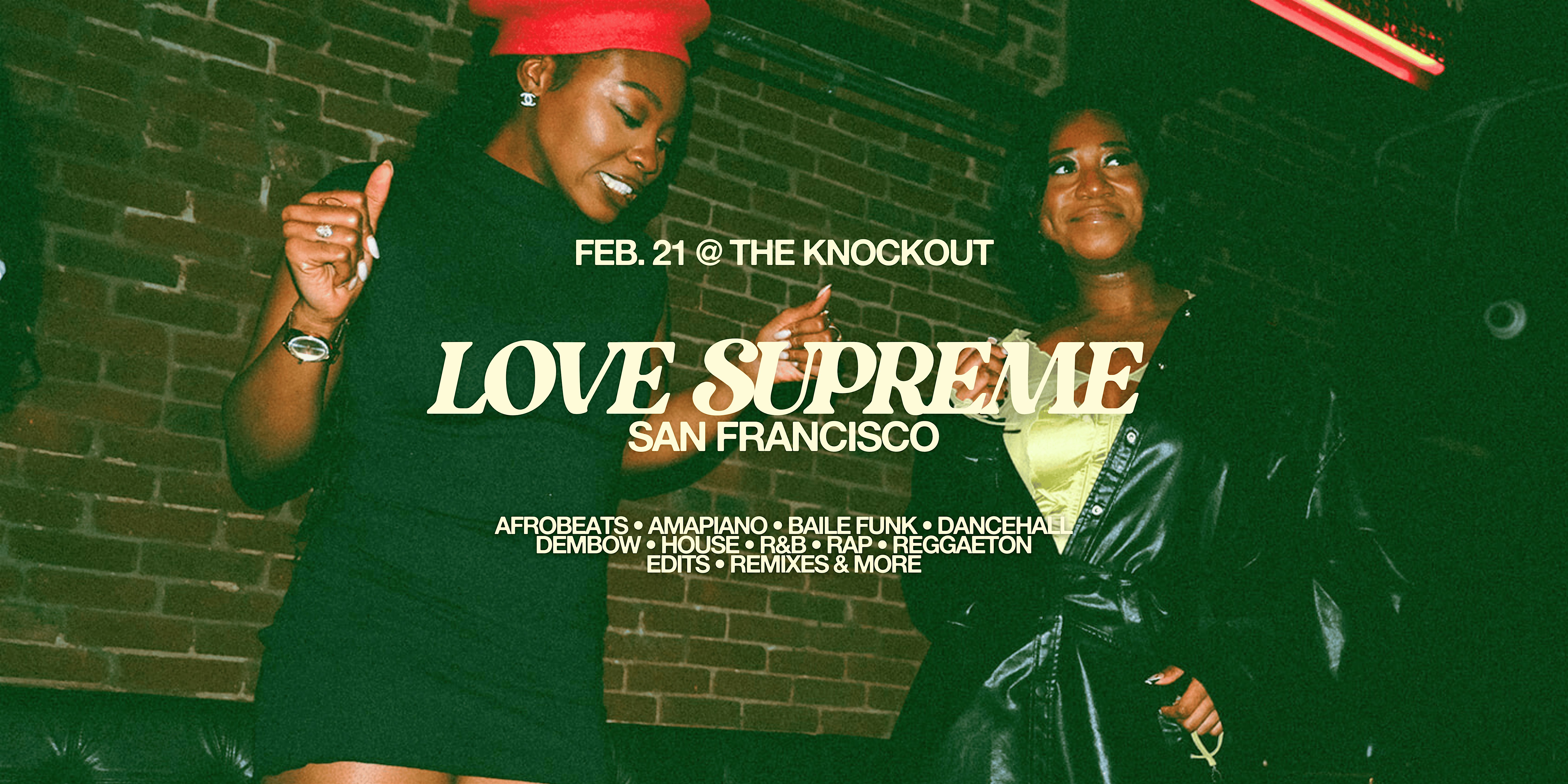 by admin12Feb LOVE SUPREME: afro, latin, caribbean, and global club music at Knockout – San Francisco, CA LOVE SUPREME: afro, latin, caribbean, and global club music at Knockout – San Francisco, CA 4 4 people viewed this event. Back for our first party of 2026. Join us for a night of the best dance music from around the globe. Tickets-RSVP Link Date And Time Sunday, February 22nd, 2026 05:00 AM (PST) Venue Knockout Location 3223 Mission Street, San Francisco, CA 94110 Event Types Concert or PerformanceMusic Event Category CaliforniaSan Francisco Share With Friends Facebook Twitter Linkedin Xing Pinterest Share This Post:
