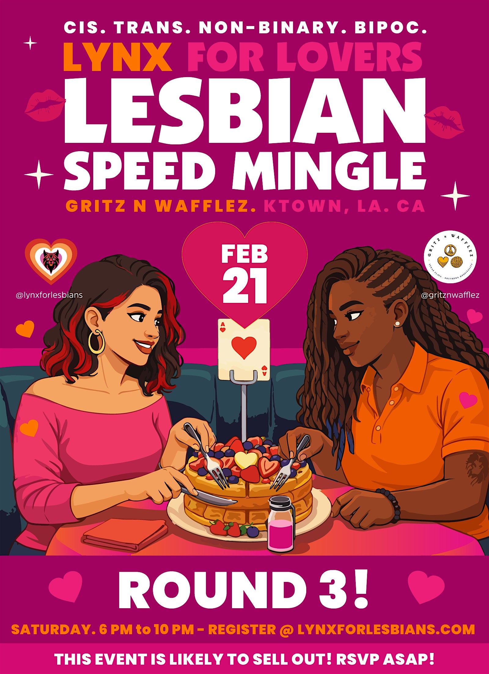 by admin13Feb LYNX for LOVERS – Lesbian Speed Mingle at Gritz n Wafflez – Los Angeles, CA LYNX for LOVERS – Lesbian Speed Mingle at Gritz n Wafflez – Los Angeles, CA 2 2 people viewed this event. February is for lovers. Whoever you love. However you love. Your person, your friends, your furbabies, yourself… love is all around. Tickets-RSVP Link Date And Time Sunday, February 22nd, 2026 02:00 AM (PST) Venue Gritz n Wafflez Location 3183 Wilshire Boulevard, Los Angeles, CA 90010 Event Types Community & CultureParty or Social Gathering Event Category CaliforniaLos Angeles Share With Friends Facebook Twitter Linkedin Xing Pinterest Share This Post: