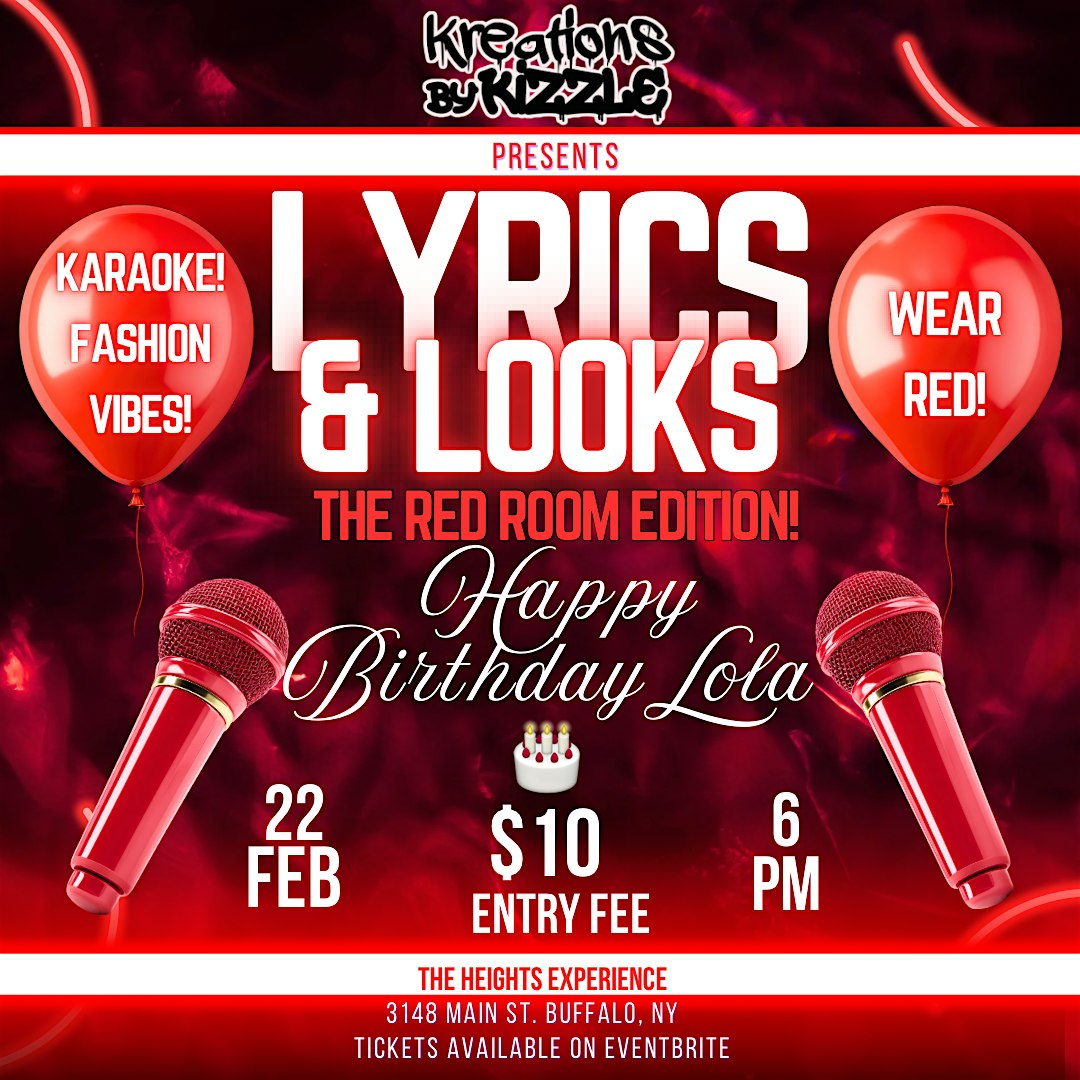 by admin12Feb LYRICS & LOOKS: Red Room Edition! at The Heights Experience – Buffalo, NY LYRICS & LOOKS: Red Room Edition! at The Heights Experience – Buffalo, NY 4 4 people viewed this event. Kreations by Kizzle presents Lyrics & Looks: The Red Room Edition. For creatives, karaoke lovers & fashion lovers. Wear red! See u there!! Tickets-RSVP Link Date And Time Sunday, February 22nd, 2026 11:00 PM (PST) Venue The Heights Experience Location 3148 Main Street, Buffalo, NY 14214 Event Types MusicParty or Social Gathering Event Category BuffaloNew York Share With Friends Facebook Twitter Linkedin Xing Pinterest Share This Post: