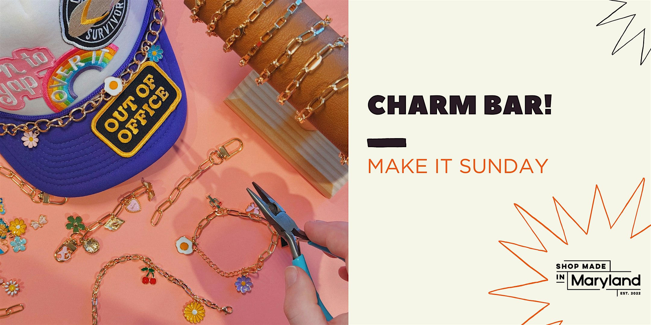 by admin13Feb Make It Sunday: Charm Bar at Shop Made in Maryland – College Park – College Park, MD Make It Sunday: Charm Bar at Shop Made in Maryland – College Park – College Park, MD 1 1 people viewed this event. Join us for a Sunday craft hour! Pick 5 of your favorite charms for a bracelet, necklace, or hat chain. Tickets-RSVP Link Date And Time Sunday, February 22nd, 2026 08:00 PM (PST) Venue Shop Made in Maryland - College Park Location 7401 Baltimore Avenue, College Park, MD 20740 Event Category Maryland Share With Friends Facebook Twitter Linkedin Xing Pinterest Share This Post: