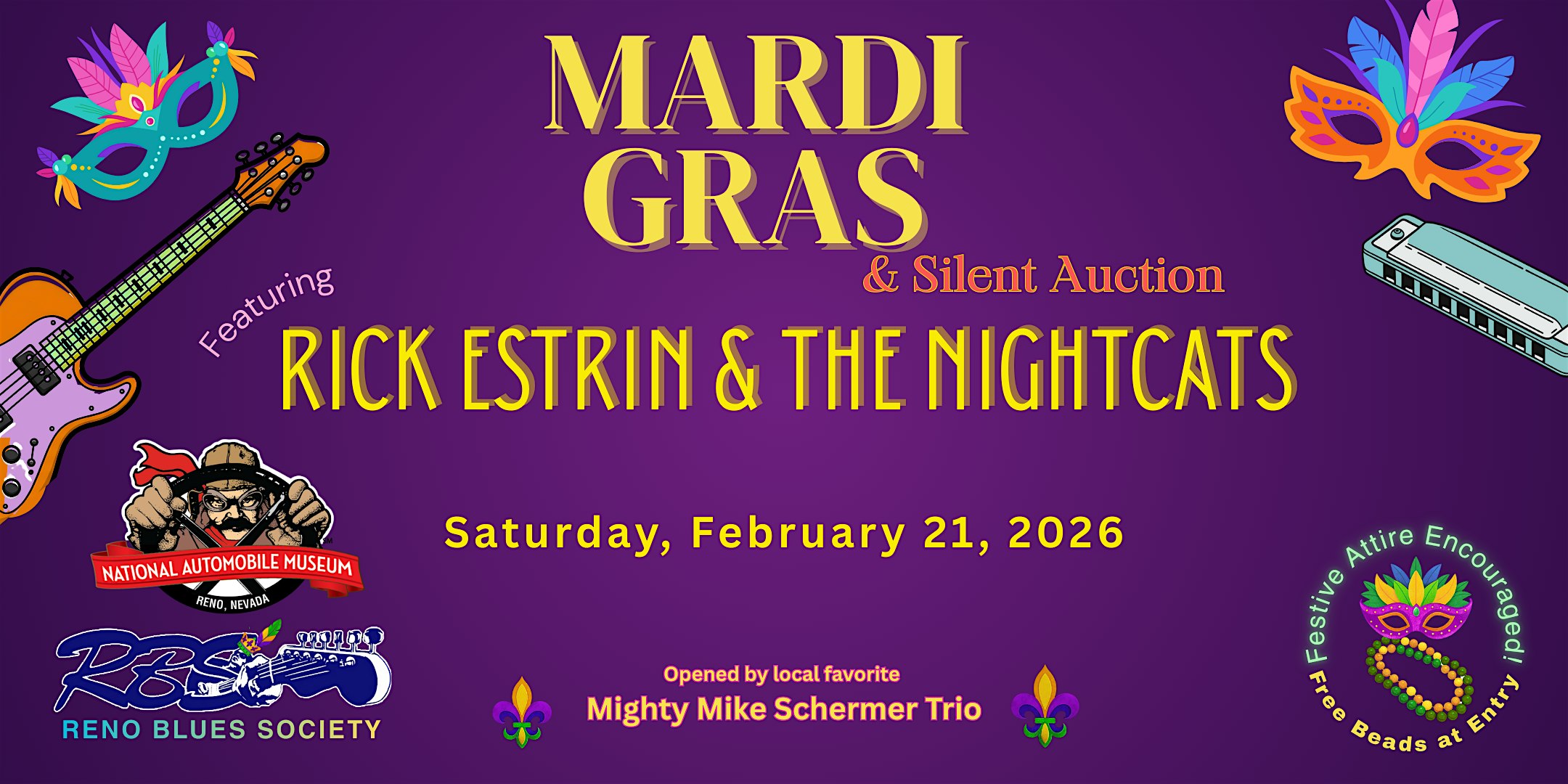 by admin12Feb Mardi Gras and Silent Auction at 1 Museum Dr – Reno, NV Mardi Gras and Silent Auction at 1 Museum Dr – Reno, NV 4 4 people viewed this event. Join us for a evening of Blues Music and Classic Cars! Tickets-RSVP Link Date And Time Sunday, February 22nd, 2026 02:00 AM (PST) Venue 1 Museum Dr Location 1 Museum Drive, Reno, NV 89501 Event Types Concert or PerformanceMusic Event Category NevadaReno Share With Friends Facebook Twitter Linkedin Xing Pinterest Share This Post: