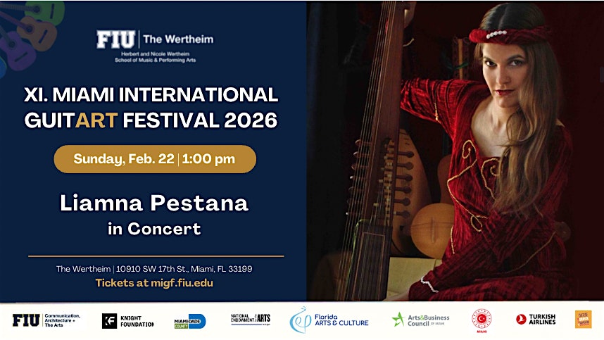by admin13Feb MIGF 2026 GuitART Festival: Liamna Pestana at Herbert and Nicole Wertheim Performing Arts Center – Miami, FL MIGF 2026 GuitART Festival: Liamna Pestana at Herbert and Nicole Wertheim Performing Arts Center – Miami, FL 2 2 people viewed this event. Extra ordinary Cuban early music specialist Liamna Pestana presents Baroque and Romantic music for guitar! Tickets-RSVP Link Date And Time Sunday, February 22nd, 2026 06:00 PM (PST) Venue Herbert and Nicole Wertheim Performing Arts Center Location 10910 Southwest 17th Street, Miami, FL 33199 Event Types Concert or PerformanceMusic Event Category FloridaMiami Share With Friends Facebook Twitter Linkedin Xing Pinterest Share This Post: