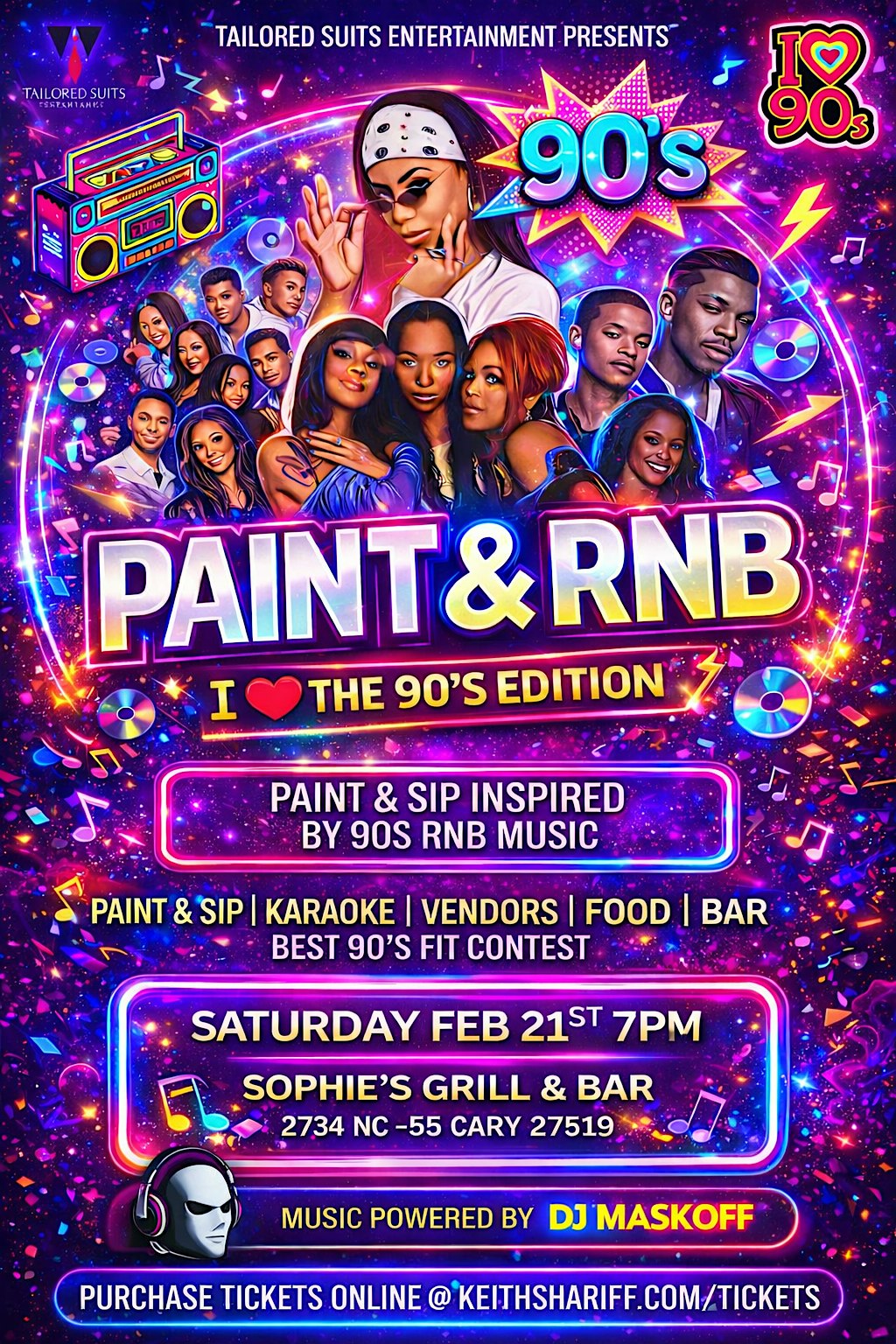 by admin13Feb Paint & RNB I Love the 90’s Edition (Paint & Sip) at Sophie’s Grill And Bar – Cary, NC Paint & RNB I Love the 90’s Edition (Paint & Sip) at Sophie’s Grill And Bar – Cary, NC 1 1 people viewed this event. A 90’s R&B–inspired Paint & Sip with karaoke, vendors, food, bar, Best 90’s Fit Contest, and music powered by DJ MaskOff. Tickets-RSVP Link Date And Time Sunday, February 22nd, 2026 12:00 AM (PST) Venue Sophie's Grill And Bar Location 2734 North Carolina 55, Cary, NC 27519 Event Types Party or Social GatheringPerforming & Visual Arts Event Category North Carolina Share With Friends Facebook Twitter Linkedin Xing Pinterest Share This Post: