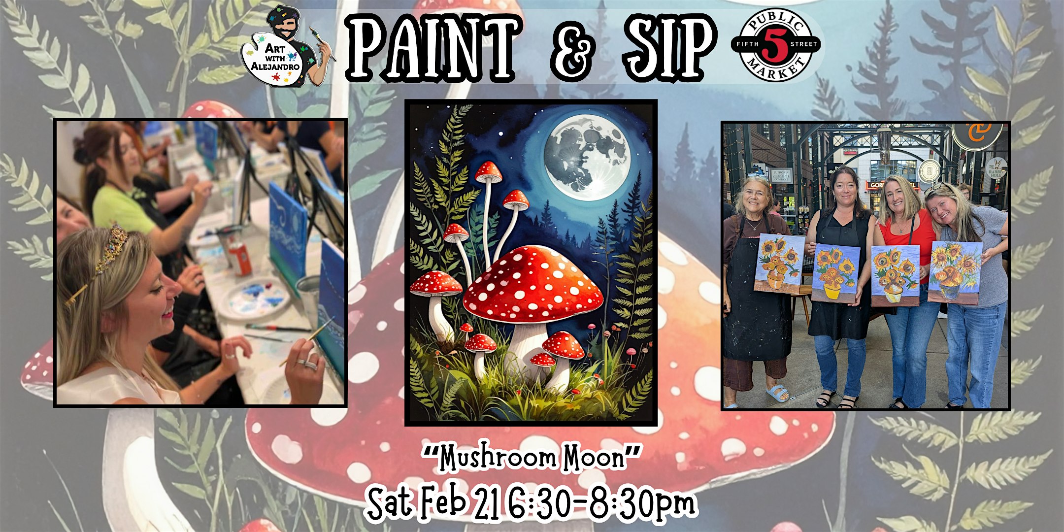 by admin12Feb Paint & Sip at 5th St Alley “Mushroom Moon” at Art with Alejandro – Eugene, OR Paint & Sip at 5th St Alley “Mushroom Moon” at Art with Alejandro – Eugene, OR 3 3 people viewed this event. Join us for a fun, creative afternoon. All skill levels welcome. Materials provided & BYOB Tickets-RSVP Link Date And Time Sunday, February 22nd, 2026 02:00 AM (PST) Venue Art with Alejandro Location 590 Pearl St, Eugene, OR 97401 Event Types Party or Social GatheringPerforming & Visual Arts Event Category EugeneOregon Share With Friends Facebook Twitter Linkedin Xing Pinterest Share This Post:
