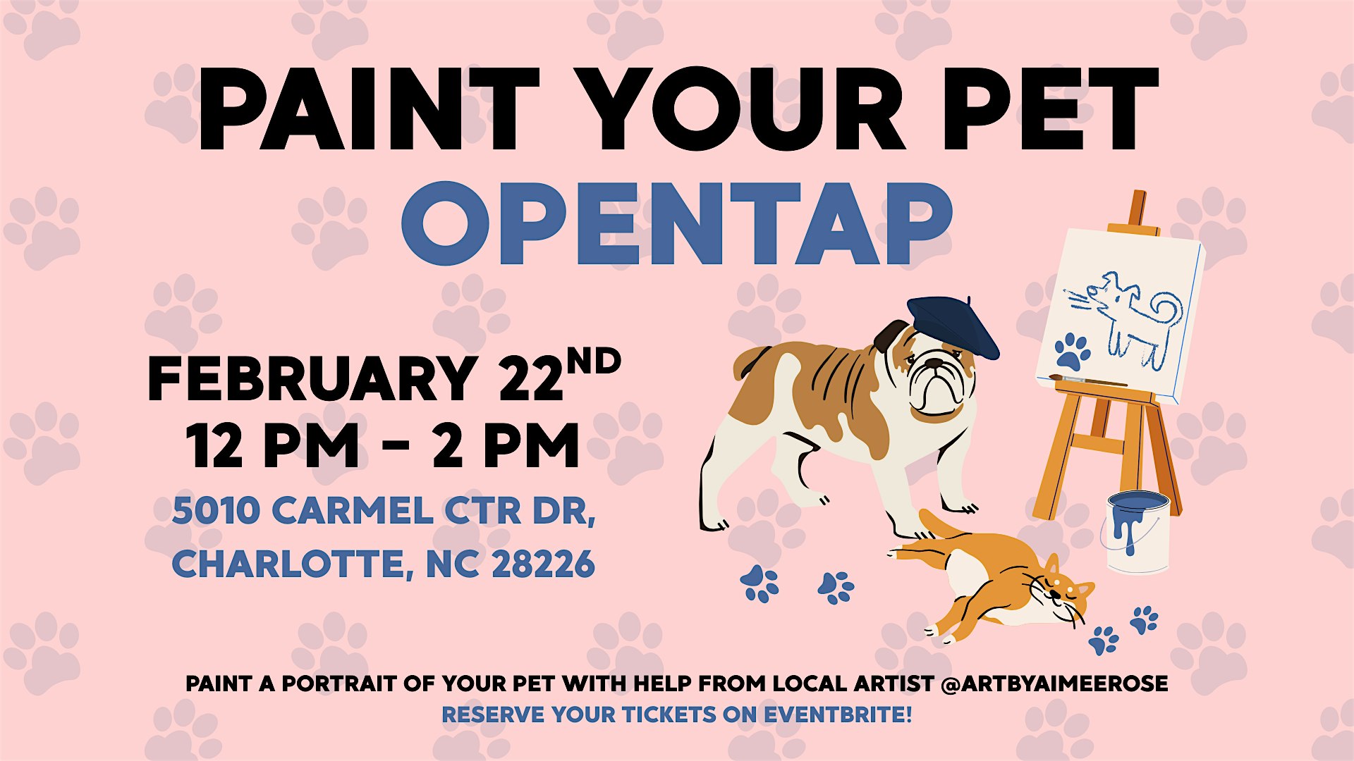 by admin13Feb Paint Your Pet at OpenTap at OpenTap – Charlotte, NC Paint Your Pet at OpenTap at OpenTap – Charlotte, NC 1 1 people viewed this event. Paint your pet’s portrait with help from local artist, Aimee-Rose while enjoying the amazing beer and wine OpenTap has to offer! Tickets-RSVP Link Date And Time Sunday, February 22nd, 2026 05:00 PM (PST) Venue OpenTap Location 5010 Carmel Center Drive, Charlotte, NC 28226 Event Category CharlotteNorth Carolina Share With Friends Facebook Twitter Linkedin Xing Pinterest Share This Post: