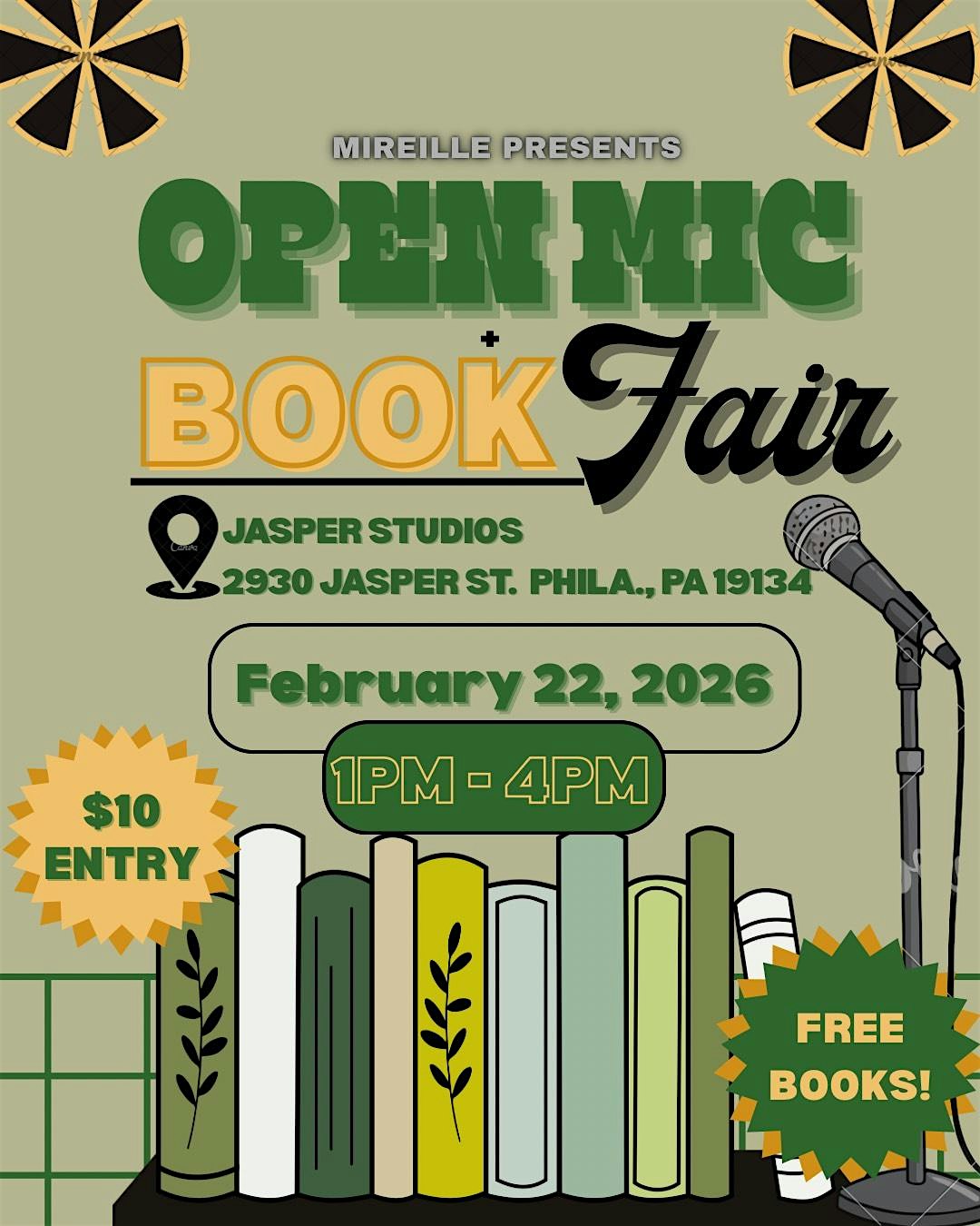 by admin12Feb POETRY OPEN MIC + BOOK FAIR at 2930 Jasper St – Philadelphia, PA POETRY OPEN MIC + BOOK FAIR at 2930 Jasper St – Philadelphia, PA 5 5 people viewed this event. @MyrayMireille presents POETRY OPEN MIC + BOOK FAIR to promote literacy in our community! Get some free books and hear/spit some poetry! Tickets-RSVP Link Date And Time Sunday, February 22nd, 2026 06:00 PM (PST) Venue 2930 Jasper St Location 2930 Jasper Street, Philadelphia, PA 19134 Event Types Party or Social GatheringPerforming & Visual Arts Event Category PennsylvaniaPhiladelphia Share With Friends Facebook Twitter Linkedin Xing Pinterest Share This Post: