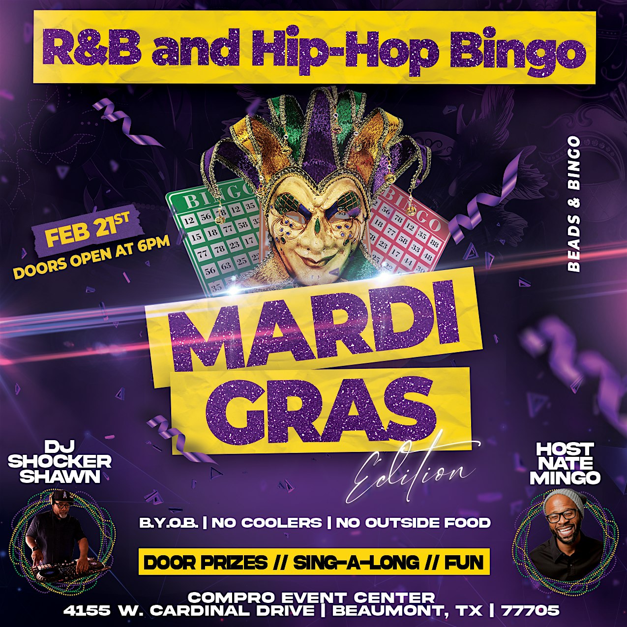 by admin12Feb R&B and Hip-Hop Bingo – Mardi Gras Edition with a Neon Twist at COMPRO EVENT CENTER – Beaumont, TX R&B and Hip-Hop Bingo – Mardi Gras Edition with a Neon Twist at COMPRO EVENT CENTER – Beaumont, TX 5 5 people viewed this event. Join us for a fun night of R&B and Hip-Hop BINGO on February 21, 2026, filled with music, prizes, and good vibes! Tickets-RSVP Link Date And Time Sunday, February 22nd, 2026 02:00 AM (PST) Venue COMPRO EVENT CENTER Location 4155 West Cardinal Drive, Beaumont, TX 77705 Event Types MusicParty or Social Gathering Event Category Texas Share With Friends Facebook Twitter Linkedin Xing Pinterest Share This Post: