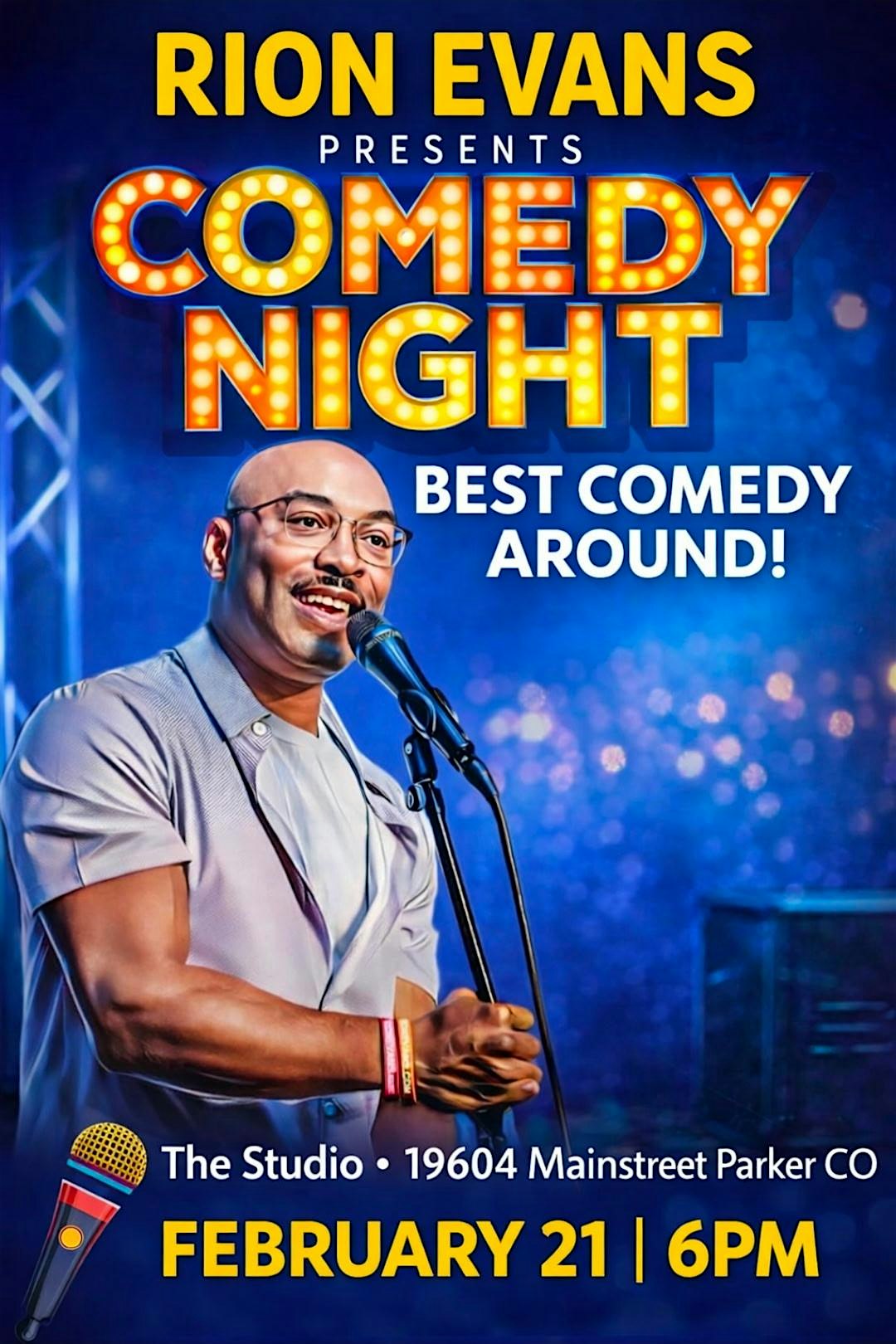 by admin12Feb RION EVANS presents COMEDY NIGHT @ The Studio at Studio@Mainstreet – Parker, CO RION EVANS presents COMEDY NIGHT @ The Studio at Studio@Mainstreet – Parker, CO 5 5 people viewed this event. Laugh your heart out with RION EVANS at The Studio’s epic comedy night – live and unmissable! Tickets-RSVP Link Date And Time Sunday, February 22nd, 2026 01:00 AM (PST) Venue Studio@Mainstreet Location 19604 Mainstreet, Parker, CO 80138 Event Types Concert or PerformancePerforming & Visual Arts Event Category Colorado Share With Friends Facebook Twitter Linkedin Xing Pinterest Share This Post: