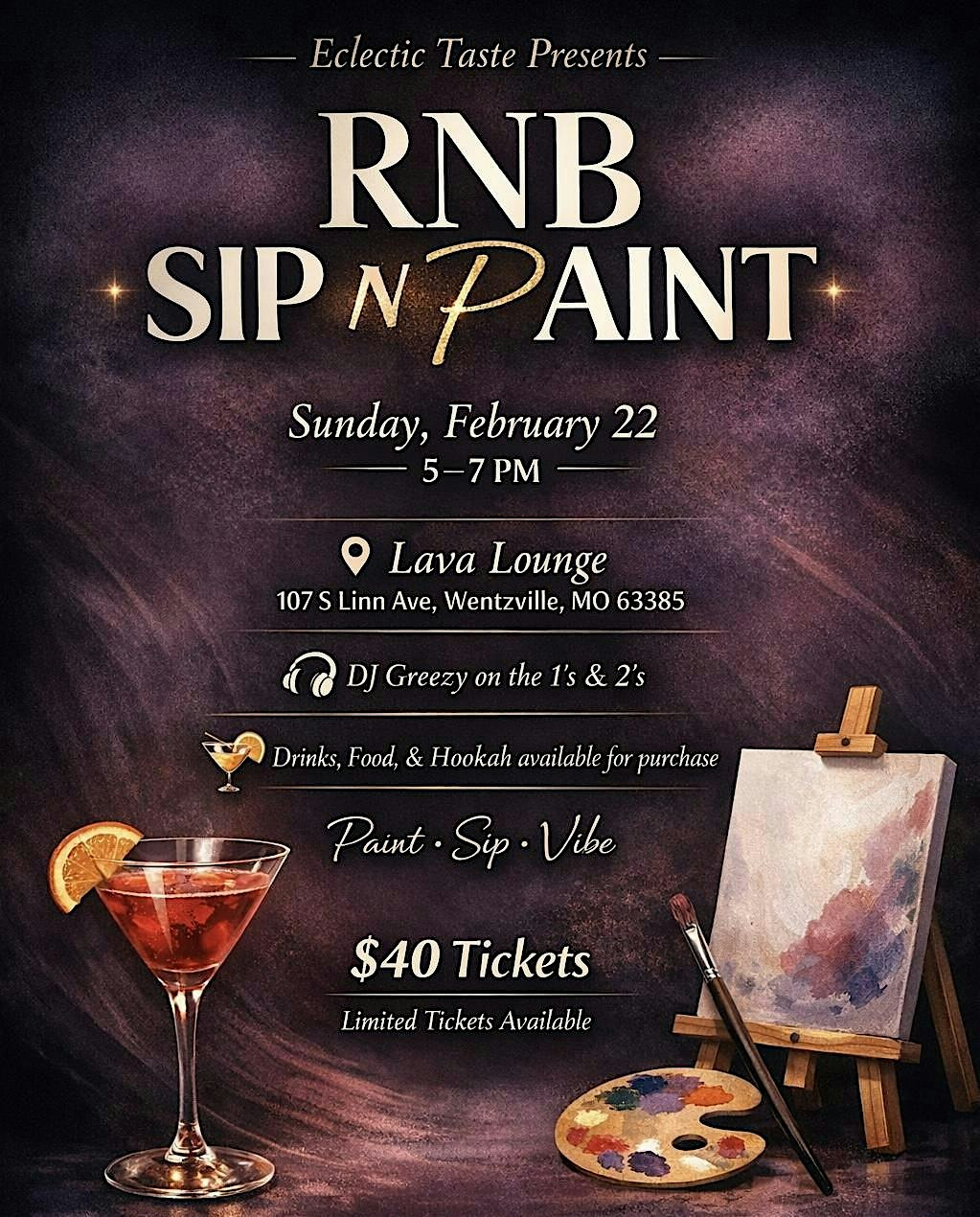by admin12Feb RnB Sip N Paint at LAVA LOUNGE Bar & Hookah – Wentzville, MO RnB Sip N Paint at LAVA LOUNGE Bar & Hookah – Wentzville, MO 3 3 people viewed this event. R&B Sip N Paint experience featuring DJ Greezy. Guided painting, cocktails, food, and hookah at Lava Lounge. Come join the fun! Tickets-RSVP Link Date And Time Sunday, February 22nd, 2026 11:00 PM (PST) Venue LAVA LOUNGE Bar & Hookah Location 107 South Linn Avenue, Wentzville, MO 63385 Event Types Party or Social GatheringPerforming & Visual Arts Event Category Missouri Share With Friends Facebook Twitter Linkedin Xing Pinterest Share This Post: